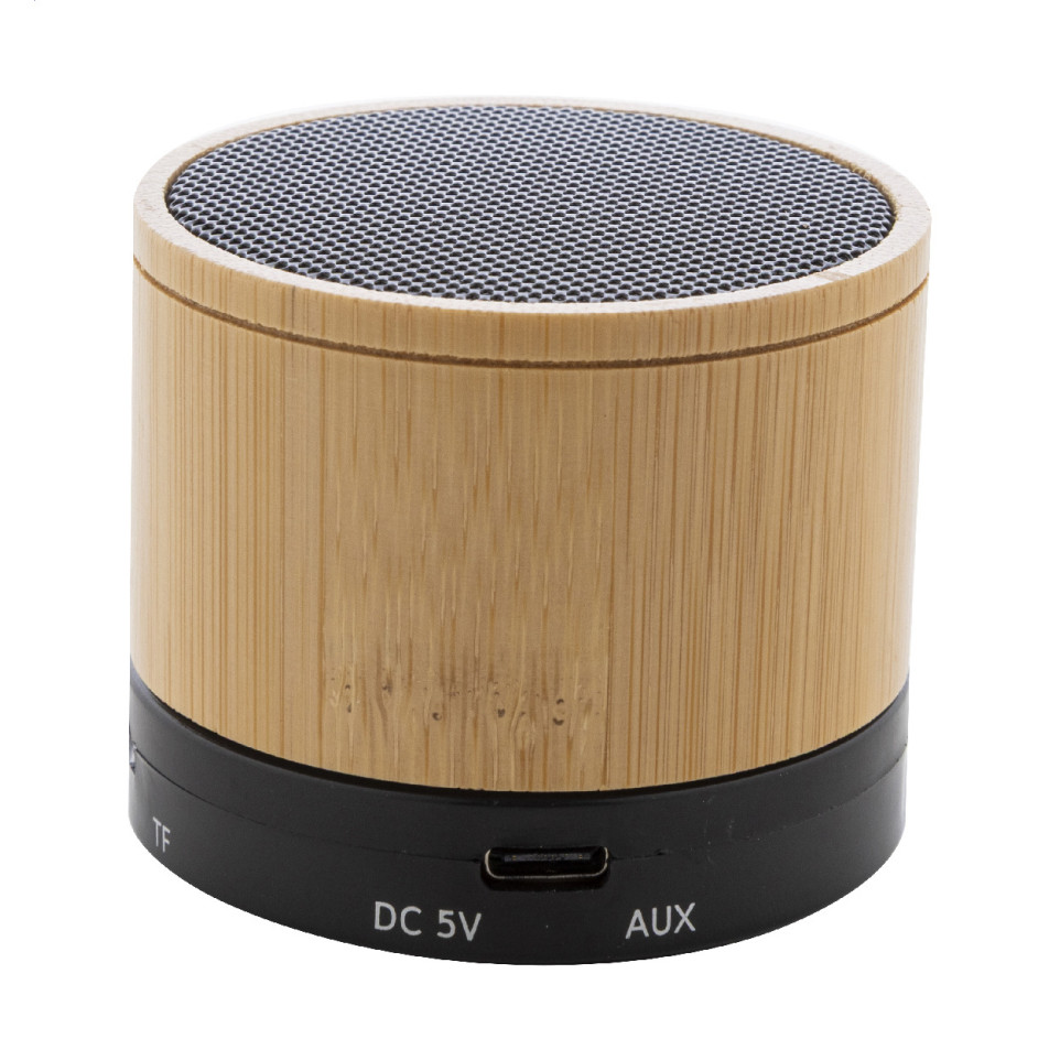 Compacte draadloze luidspreker in zwart gerecycled ABS met bamboe accenten en metalen gaas, ideaal voor mobiel muziekgebruik, handsfree bellen en micro SD MP3-afspelen. Inbegrepen USB-laadkabel.