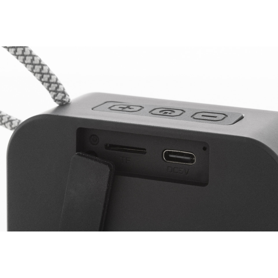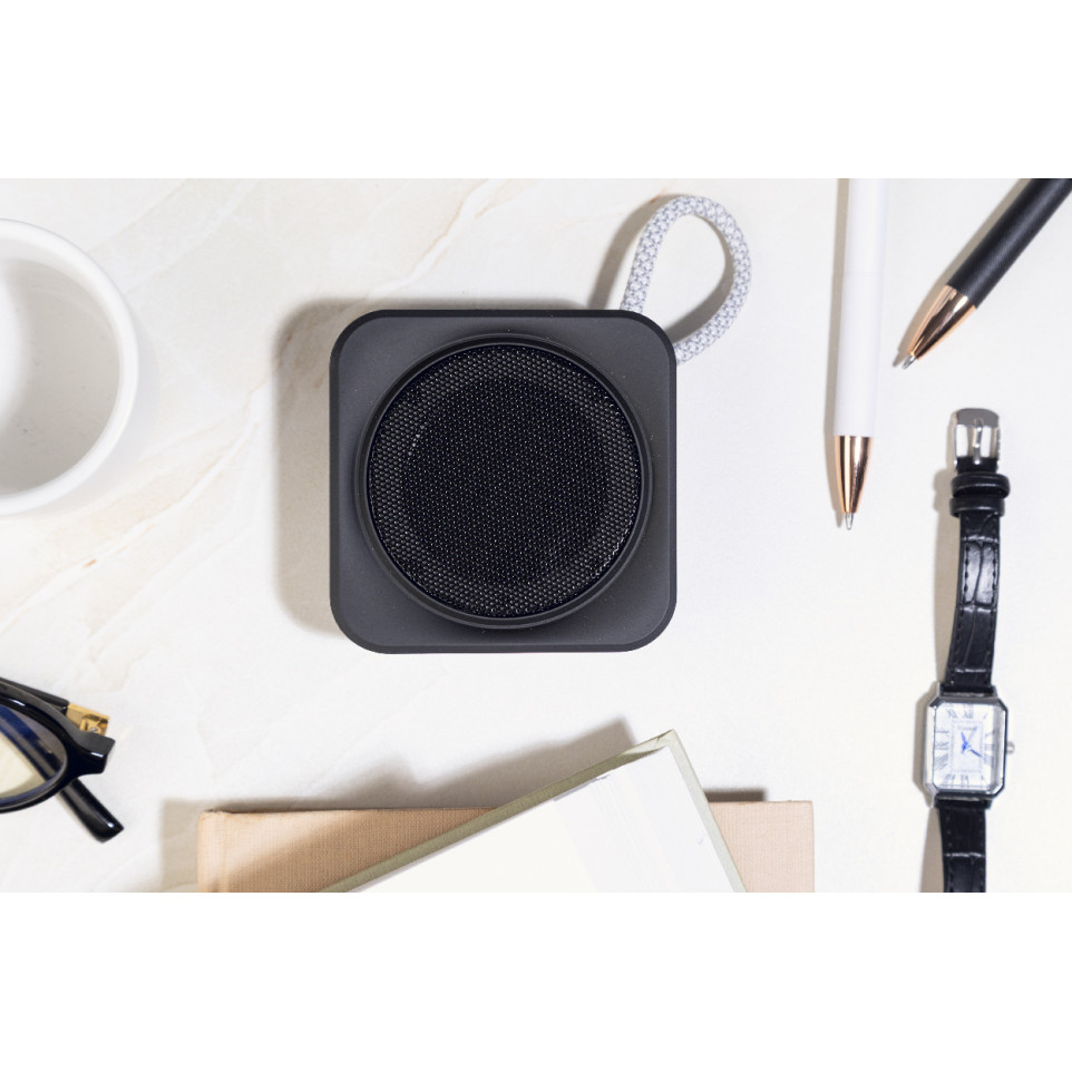 Compacte, draagbare luidspreker in zwart gerecycleerd ABS met metalen gaas en handige draagriem. Ideaal voor onderweg, thuis of op kantoor dankzij het draadloze ontwerp en ingebouwde accu.