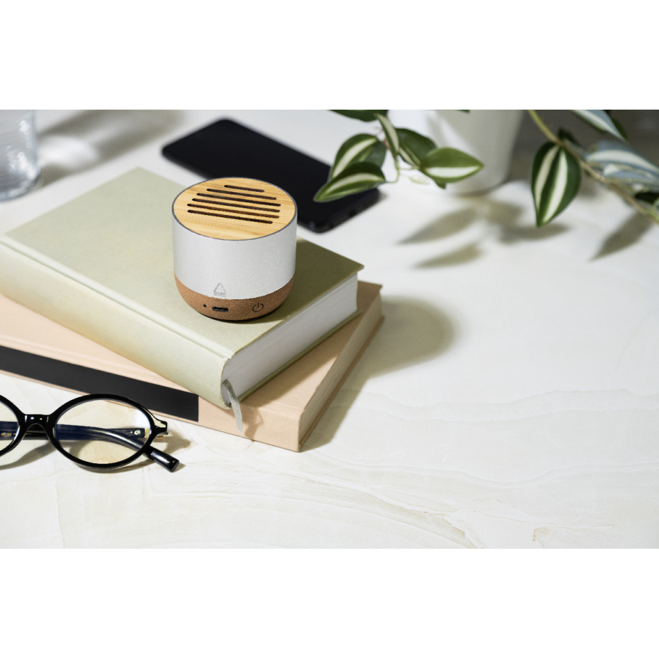 Compacte draadloze luidspreker Corbofi zilver, perfect geschikt voor mobiel gebruik binnenshuis of onderweg. Combineert krachtig geluid met een stijlvol en duurzaam ontwerp voor dagelijks audioplezier.