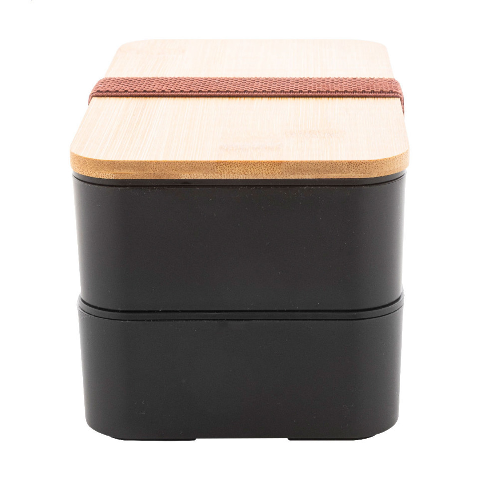 Stijlvolle zwarte lunchbox van PP-plastic met geïntegreerd bestekset (vork, lepel en mes), bamboe deksel en elastische band. Twee afzonderlijke compartimenten van elk 700 ml maken het ideaal voor lunch op kantoor, onderweg of tijdens een picknick.