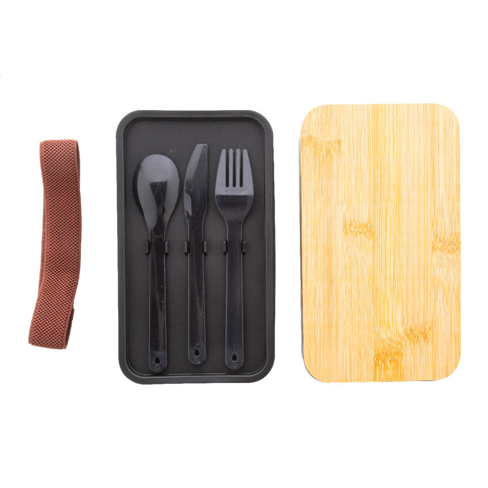 De lunchbox is gemaakt van PP-plastic met een bamboe deksel en wordt geleverd met een bijpassend bestekset.