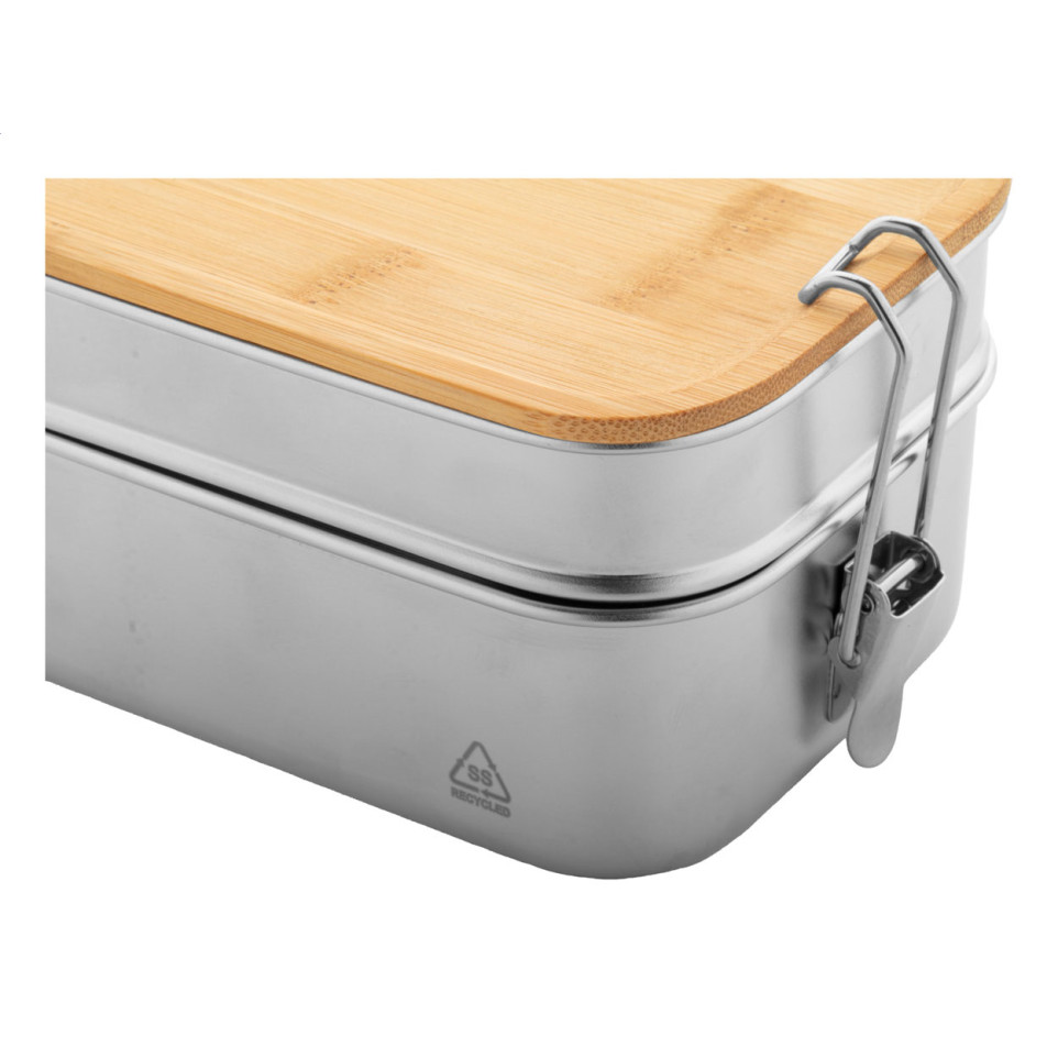 De lunchbox is vervaardigd uit gerecycled roestvrij staal met een deksel van bamboe.