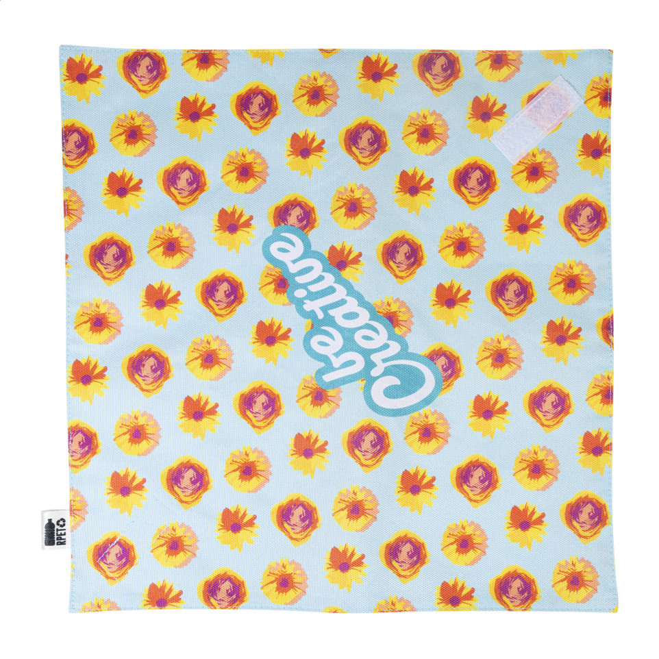 Opvouwbare en herbruikbare sandwichwrap in wit RPET-polyester voor het inpakken van snacks of broodjes. Custom made met all over sublimatiebedrukking, voorzien van waterdichte voering en klittenbandsluiting. Ideaal voor dagelijks gebruik of promotie.