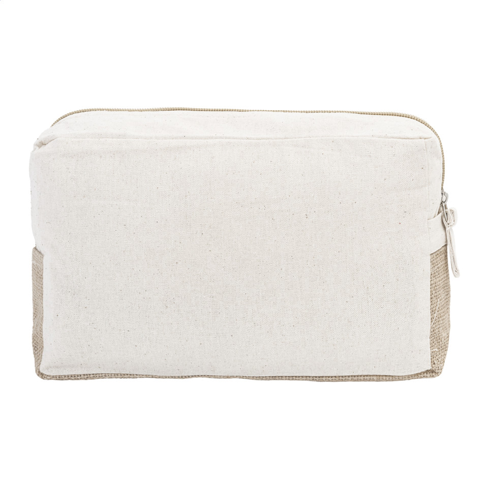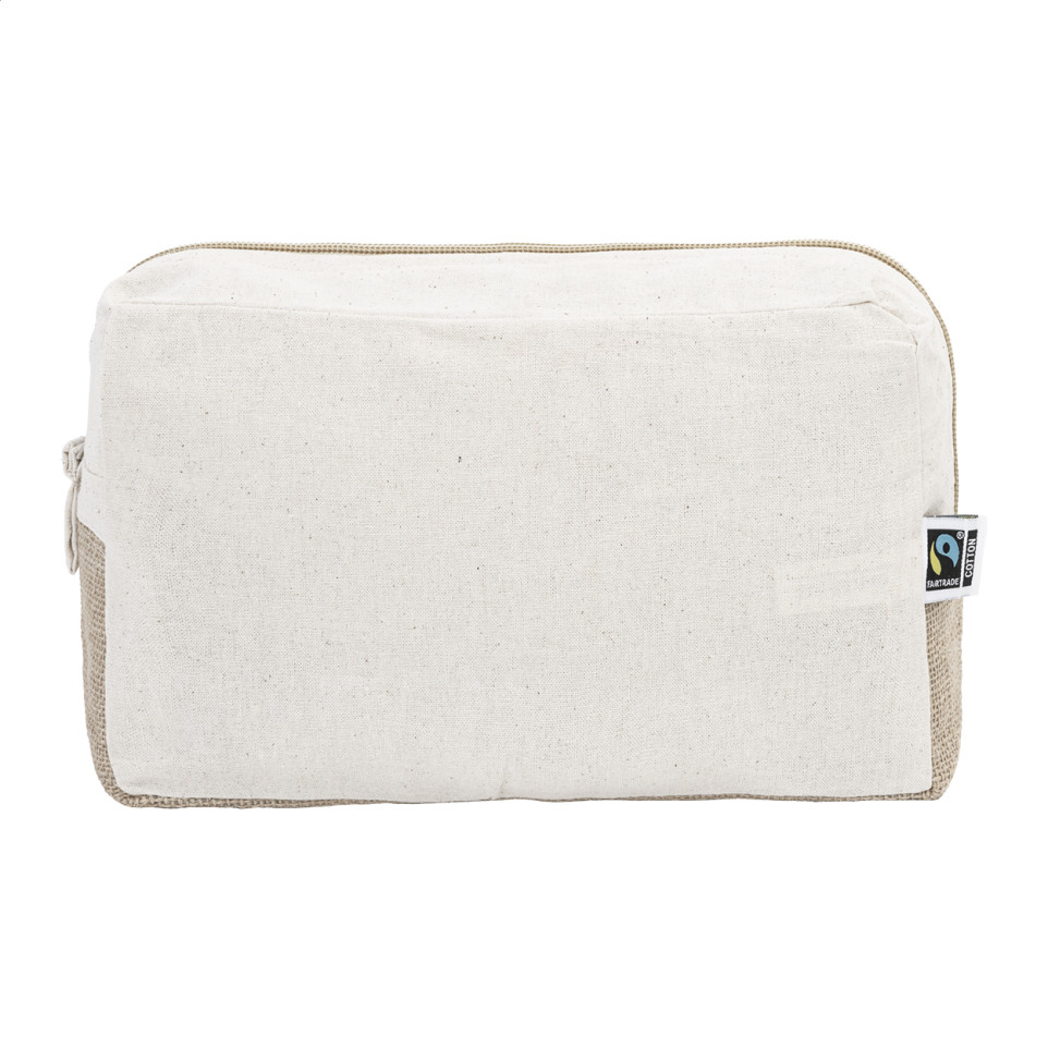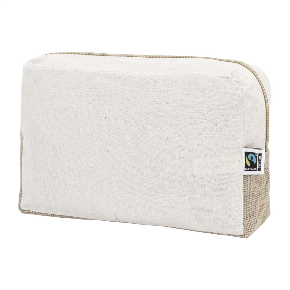 Ruime cosmetica tas met rits, vervaardigd uit 100% Fairtrade katoen (180 g/m²) en gelamineerde jute. Ideaal voor het opbergen van make-up en verzorgingsproducten thuis of onderweg.