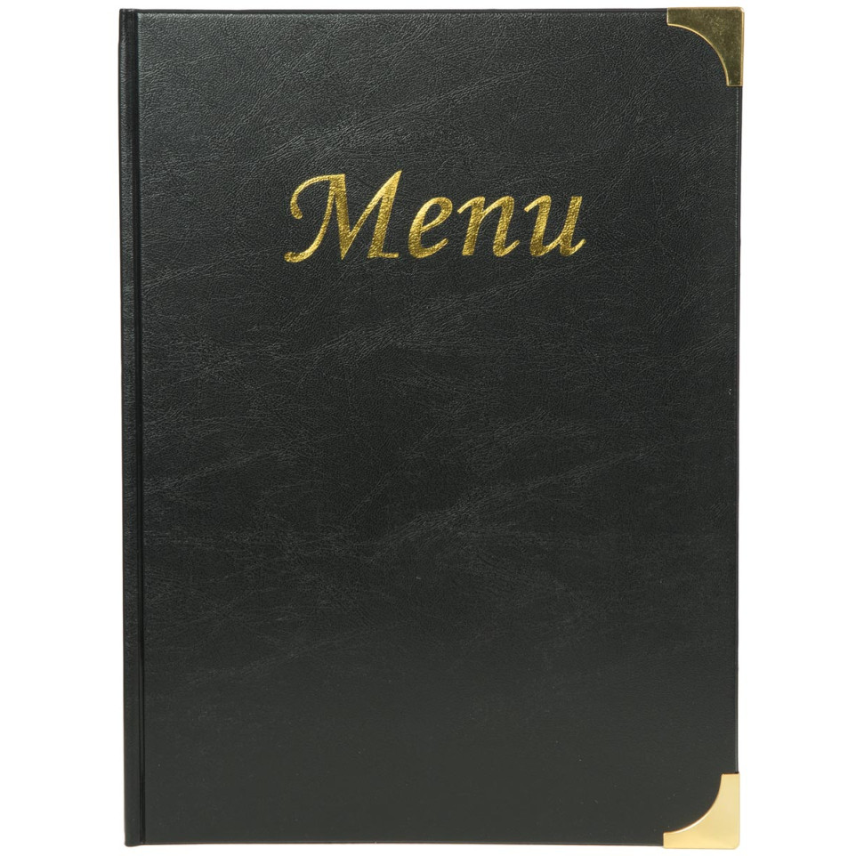 De Securit menukaart Basic ft A4 in zwart is een professionele menumap met lederlook cover en gouden print, voorzien van stevige metalen randbeschermers. Ideaal voor gebruik in horeca, cafés of restaurants waar informatie overzichtelijk en stijlvol gepresenteerd moet worden.