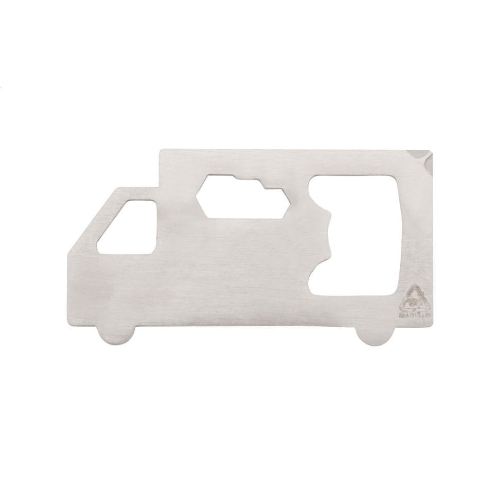 Deze Bessito multitool in truckvorm is vervaardigd uit gerecycled roestvrij staal en combineert functionaliteit met duurzaamheid. Met een flesopener, Philips schroevendraaier en 3 platte steeksleutels biedt dit compacte gereedschap oplossingen voor dagelijkse klusjes.
