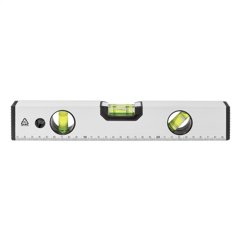 Magnetisch waterpas van gerecycled aluminium, voorzien van drie geïntegreerde libellen (voor horizontaal, verticaal en 45° meten) en een ingebouwde liniaal van 30 cm. Geschikt voor nauwkeurig uitmeten en aftekenen in veelzijdige werkomgevingen.