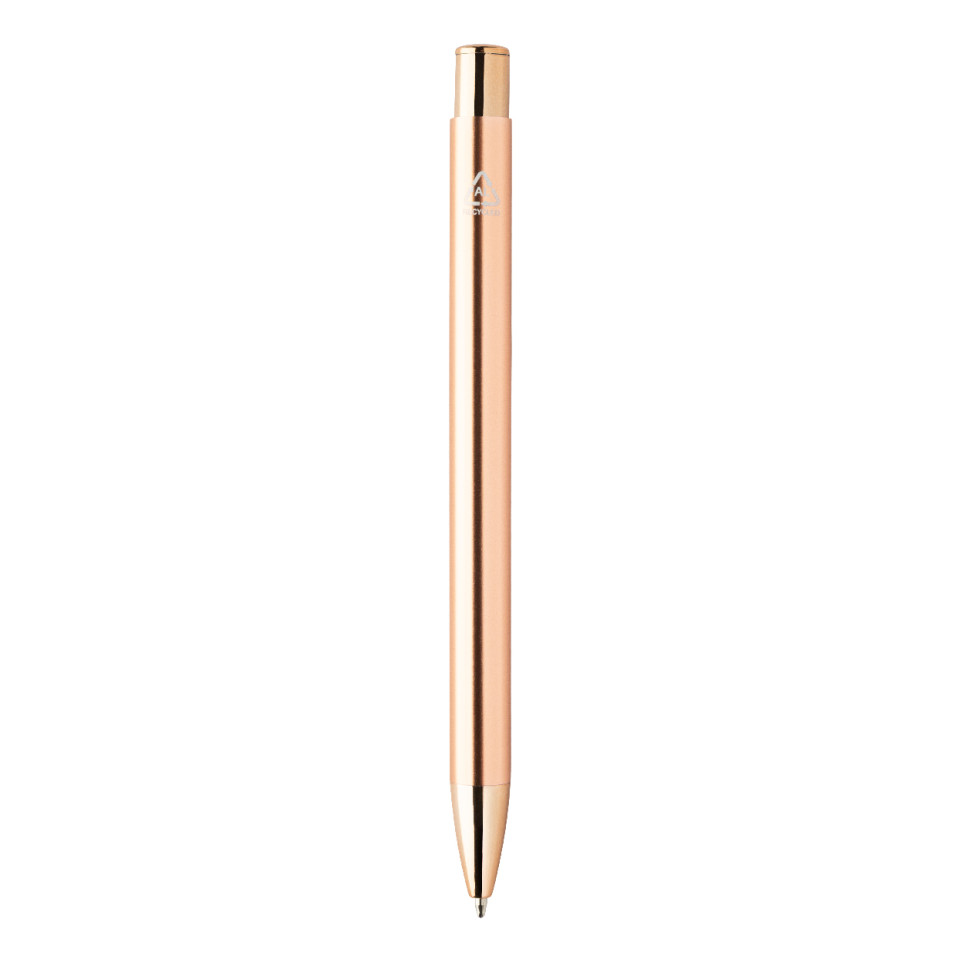 De pen bestaat uit gerecycled aluminium, wat duurzaamheid en milieubewustzijn combineert.