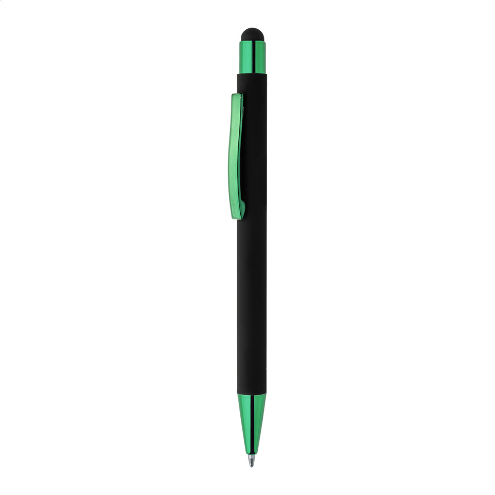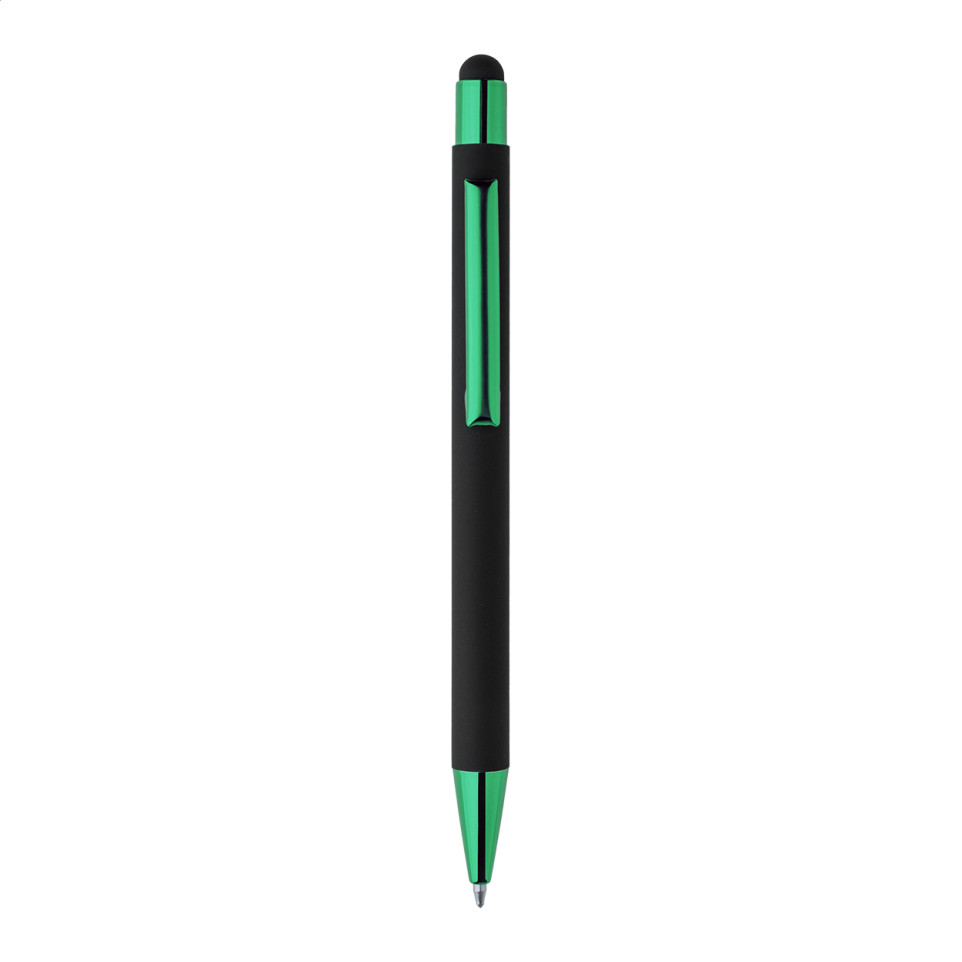 Gerecycleerde aluminium touchscreen-balpen met zwarte rubberen behuizing en groene glanzende metalen afwerkingsonderdelen. Schrijft in blauw en ondersteunt touchfunctie voor smartphones en tablets.