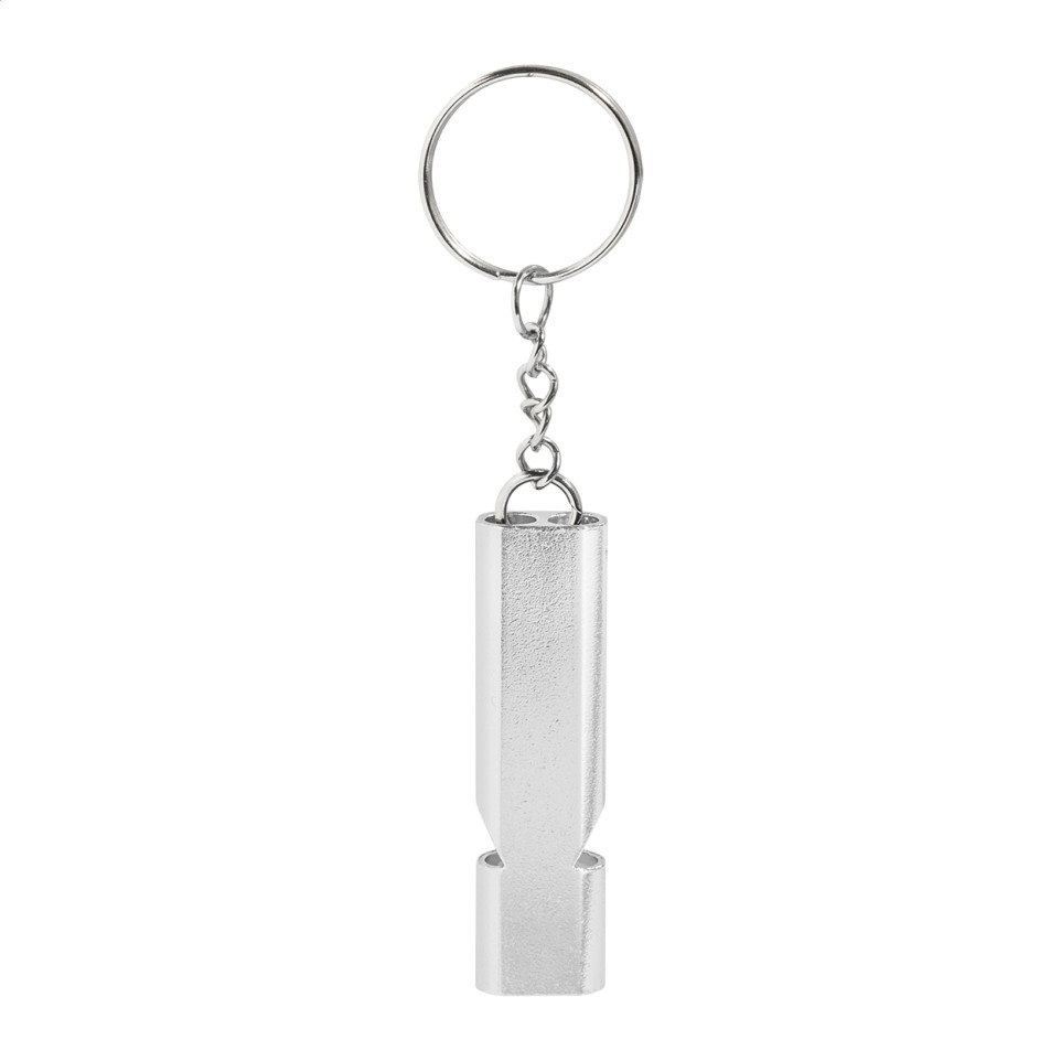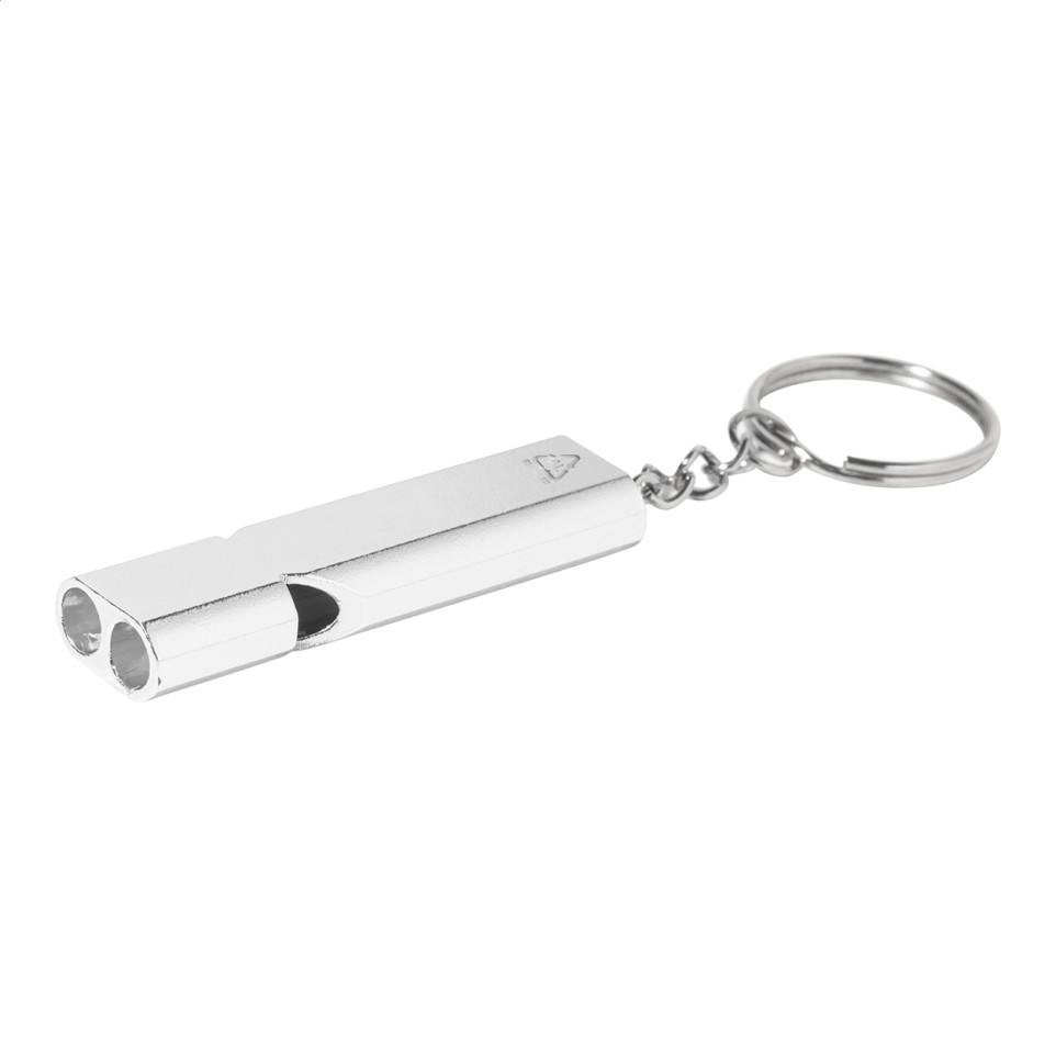 Gerecycled aluminium fluitje met metalen sleutelhanger. Compact en praktisch accessoire dat zowel functioneel als duurzaam is voor dagelijks gebruik.