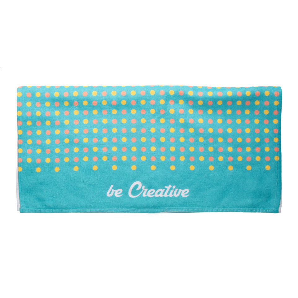 Dubbelzijdige handdoek met sublimatieprint op één zijde, vervaardigd uit 100% katoen en 100% microvezel, 400 g/m². Ideaal als relatiegeschenk of promotiemateriaal voor sport, wellness, of evenementen.