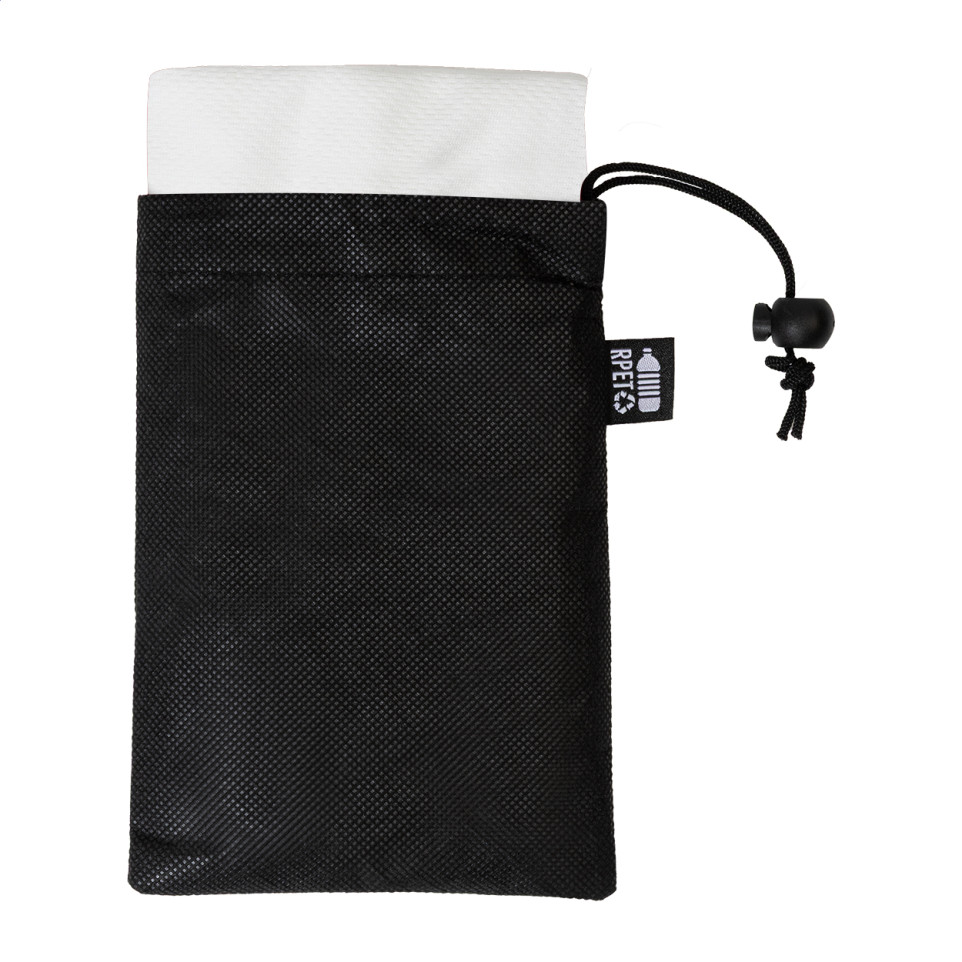 Een duurzame RPET microvezel sporthanddoek, geleverd in een bijpassende RPET non-woven draagtas. Ideaal voor sport, fitness, reizen en outdoor-activiteiten.