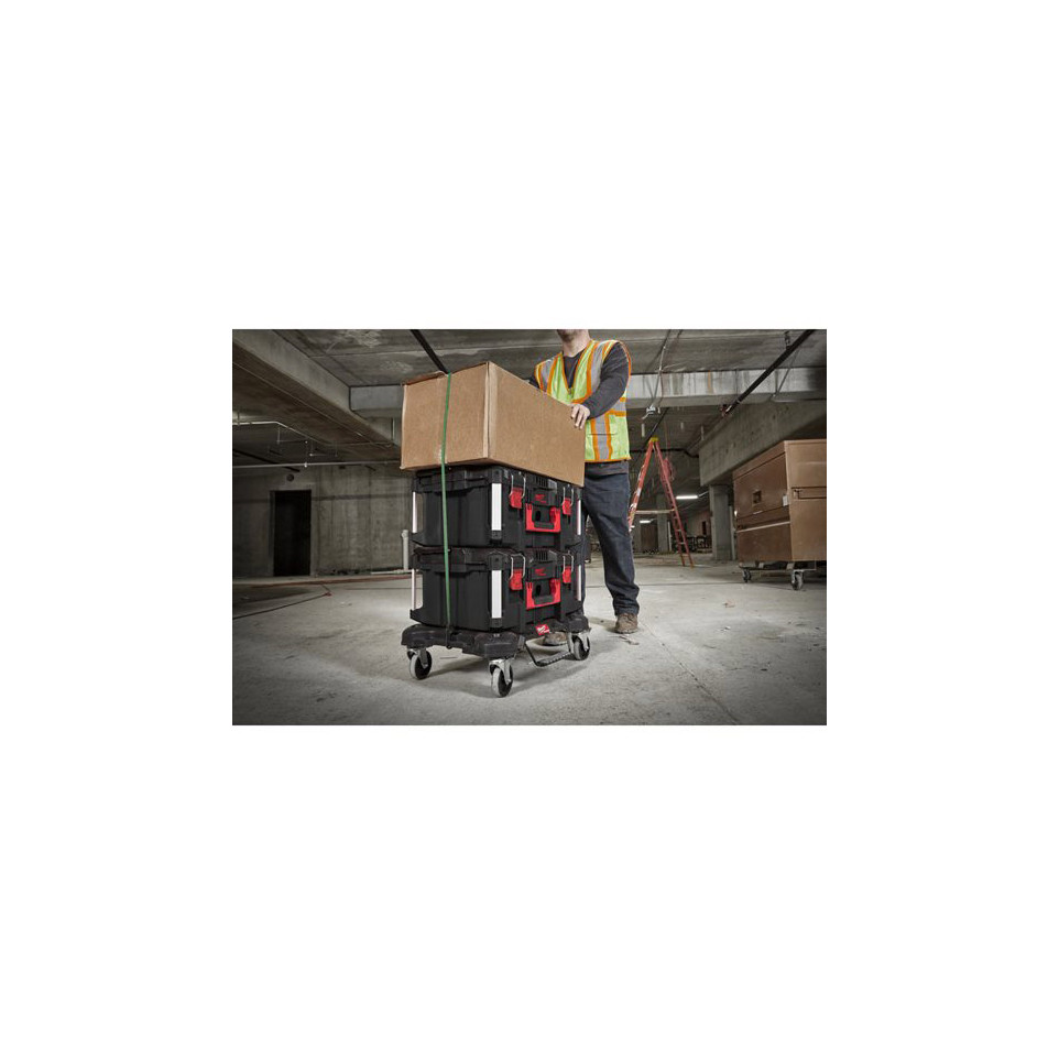 Bevestig eenvoudig Milwaukee PACKOUT koffers of tassen op de trolley via het modulaire kliksysteem. Rol veilig over verschillende ondergronden dankzij stevige wielen en borg de trolley indien nodig met de rem- en wielsloten. Ideaal voor transport van gereedschap en materialen van en naar de klus.