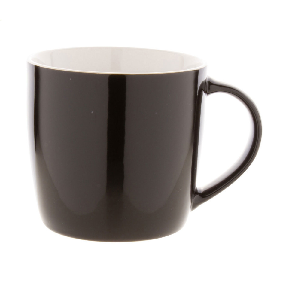Hemera zwart-witte mok met een inhoud van 370 ml, vervaardigd uit hoogwaardige gekleurde keramiek met een witte binnenkant. Geleverd in een stevige kraft papieren doos, ideaal voor dagelijks gebruik op kantoor, thuis of als relatiegeschenk.