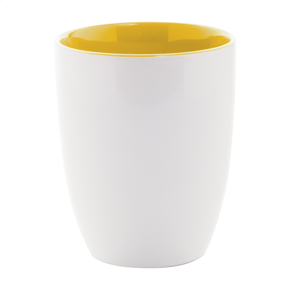 De Maia gele mok met wit binnenwerk is een hoogwaardige keramische beker van 300 ml, perfect voor dagelijks gebruik op kantoor of thuis. Geleverd in een milieuvriendelijke kraft papieren verpakking.