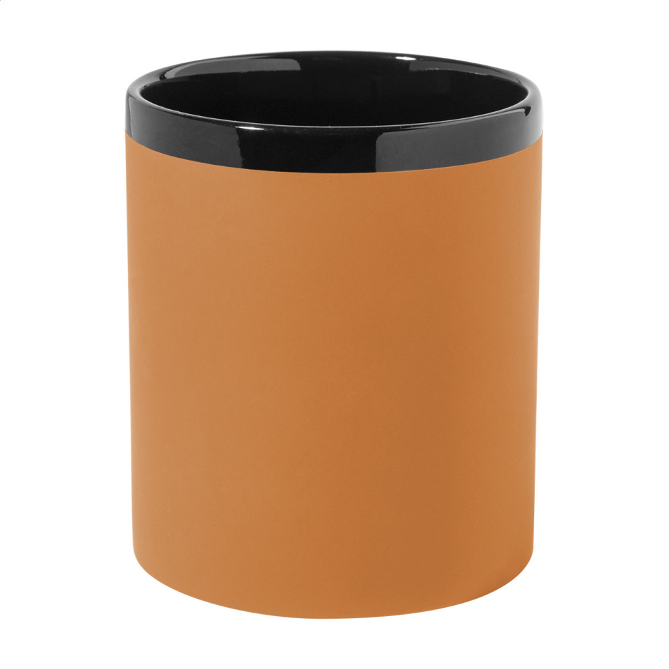 De Kovary oranje mok is een keramische drinkbeker van 300 ml met een opvallende soft-touch rubberen buitenafwerking en een strakke zwarte binnenkant en rand.