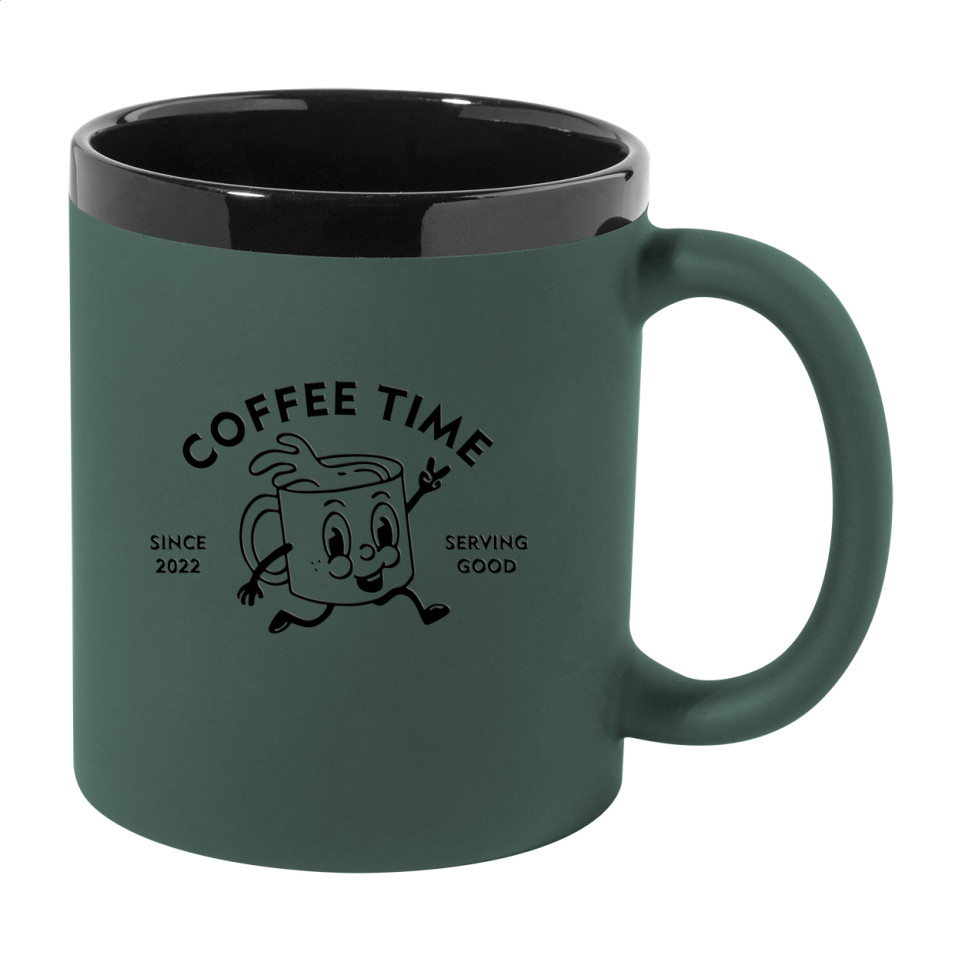 Bekijk producten in dezelfde categorieKeramische mok Kovary groen met soft-touch rubberen afwerking, zwarte binnenkant en rand, capaciteit 300 ml. Ideaal voor dagelijks gebruik of als relatiegeschenk.