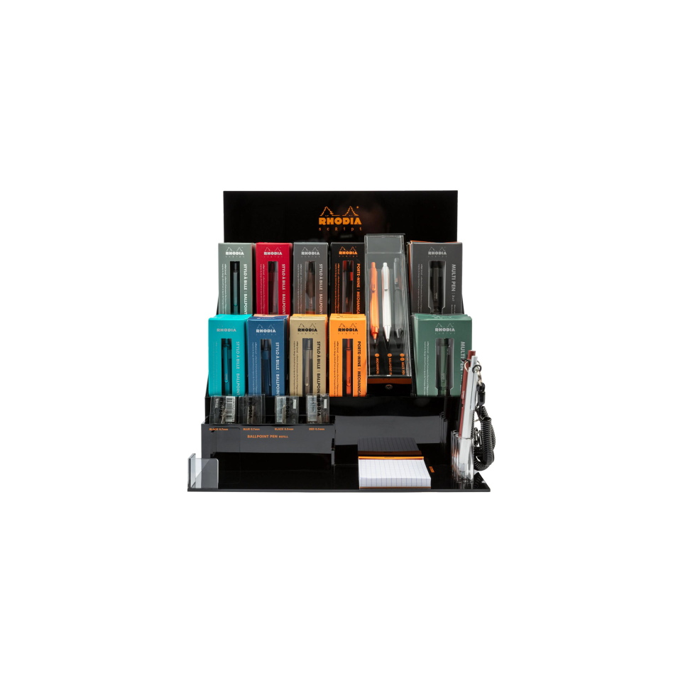 Rhodia scRipt plexi display - 3 assortimenten Capaciteit: 8 Multi Pen, 32 balpennen of vulpotloden. Vullingen: rood, zwart en blauw Testblok met een exemplaar van de 3 reeksen om uit te testen. Mogelijkheid om flyers toe te voegen.