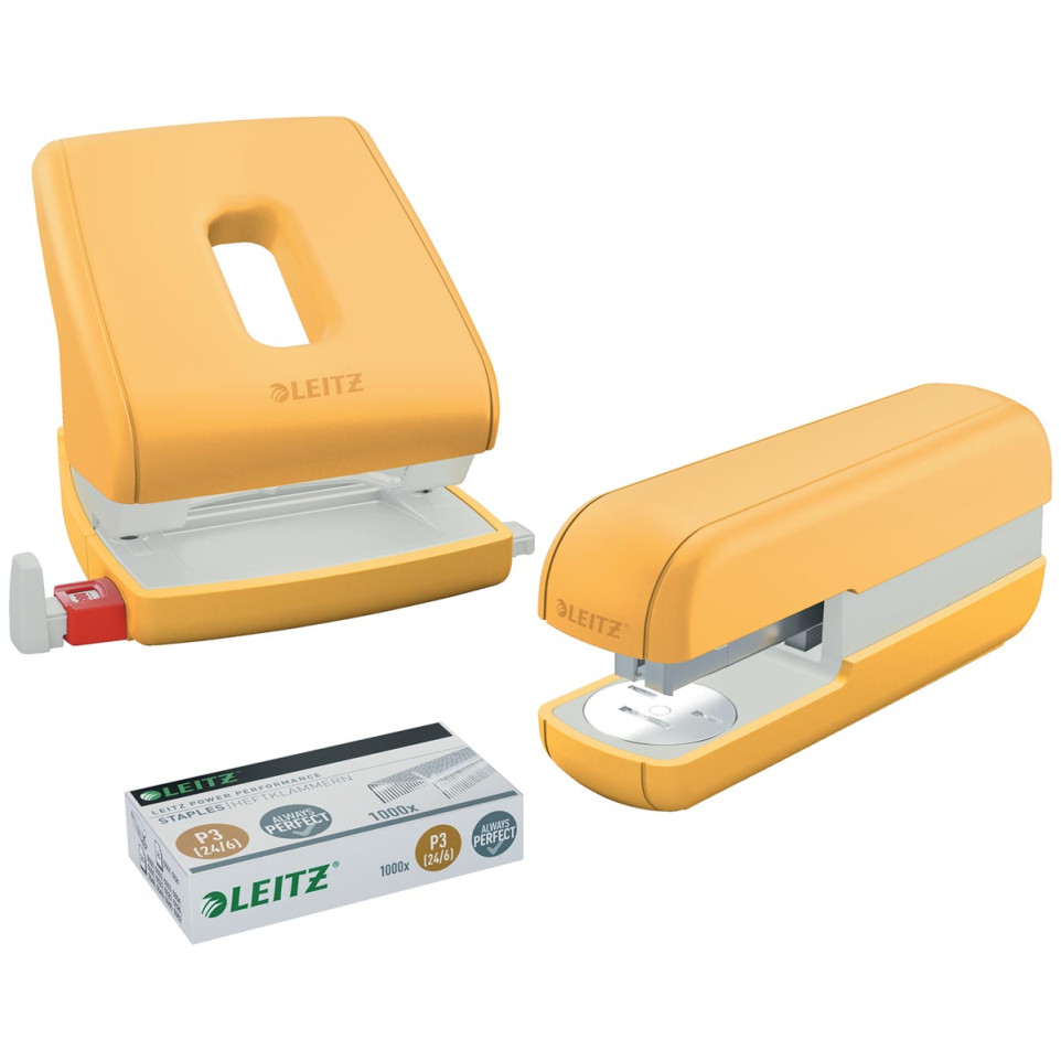 De Leitz Cosy nietmachine in warm geel is geschikt voor dagelijks gebruik op kantoor en thuis. Niett tot 30 vellen papier met standaard 24/6 of 26/6 nietjes.