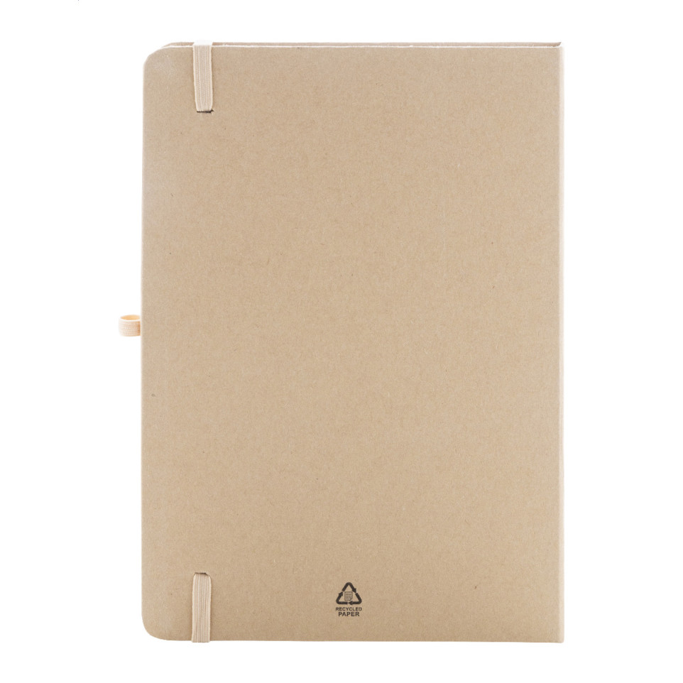 Compact A5 notitieboek met gerecycled karton als kaft, 70 blanco vellen van gerecycled papier, en meerdere praktische accessoires. Ideaal voor vergaderingen, notities onderweg of creatieve schetsen.