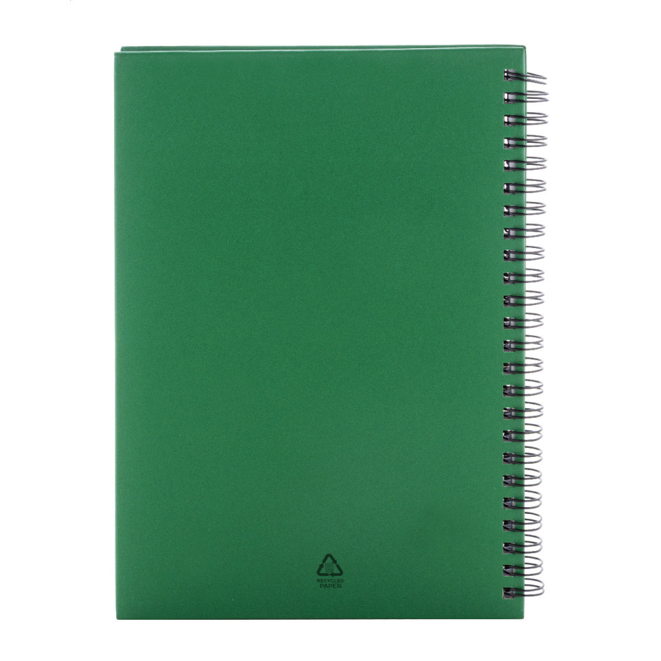 Handig A5-notitieboek in groen met spiraalrug, voorzien van een omslag uit gerecycled papier en 80 gelinieerde vellen, ideaal voor dagelijkse aantekeningen thuis, op kantoor of onderweg.