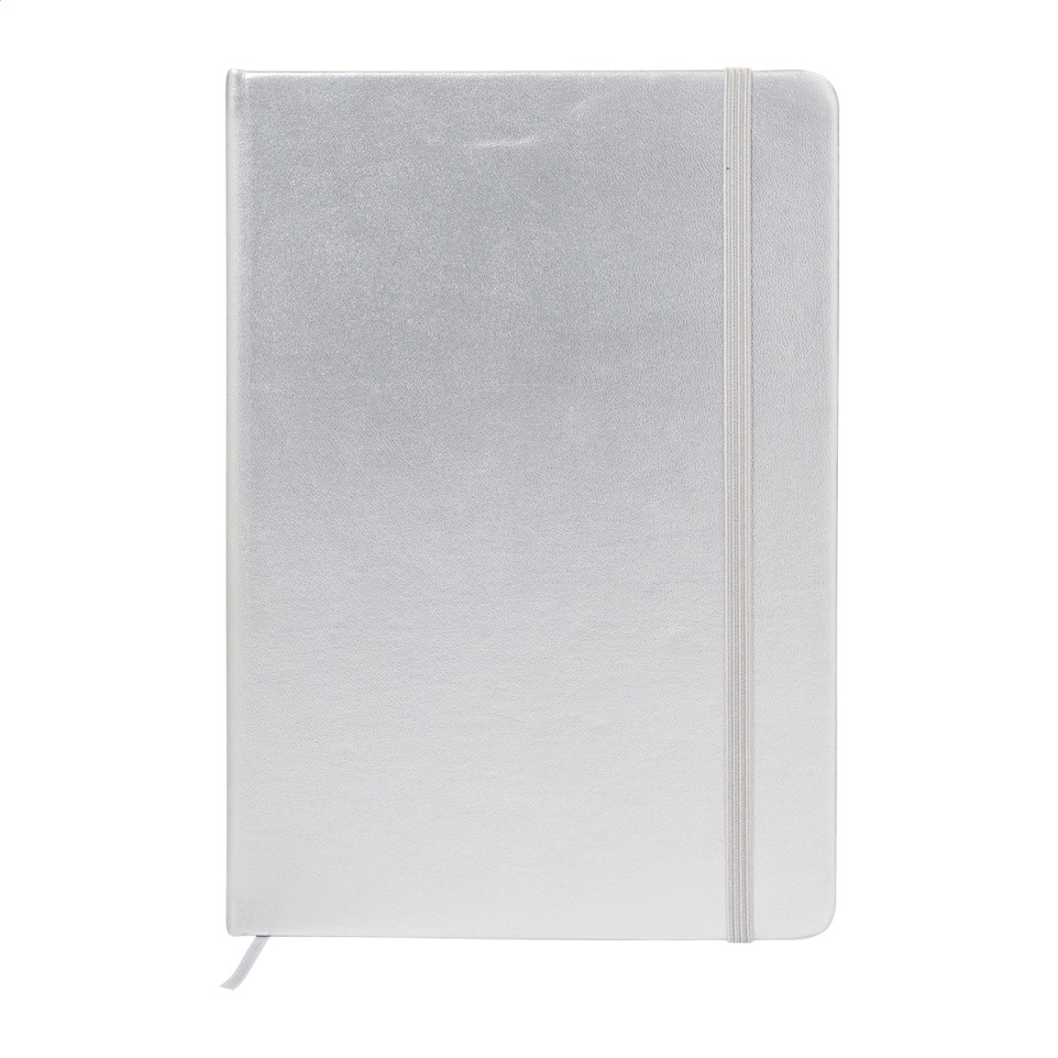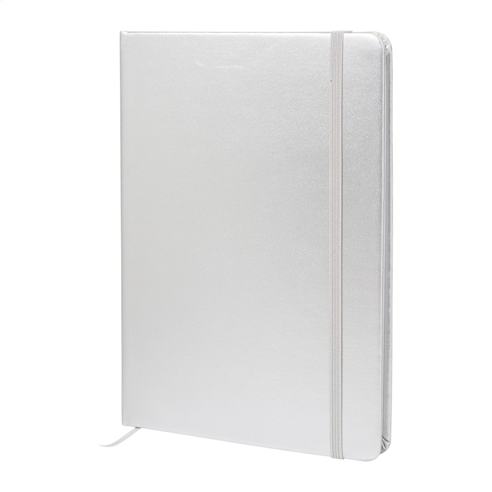 Het Oropuk A5 notitieboekje in zilver combineert een metallic afwerking met duurzame materialen. Ideaal voor dagelijks gebruik op kantoor of onderweg, met een stijlvol en verantwoord design.