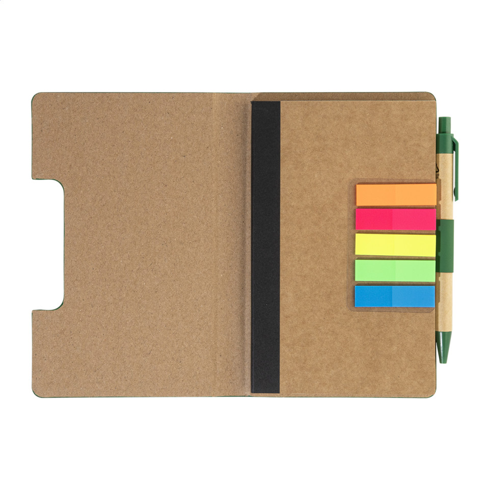 Duurzaam notitieboekje met gerecycled PU-leer omslag, voorzien van 70 gevoerde vellen in gerecycled papier en praktische pagina-markers in vijf kleuren, inclusief gerecyclede balpen.