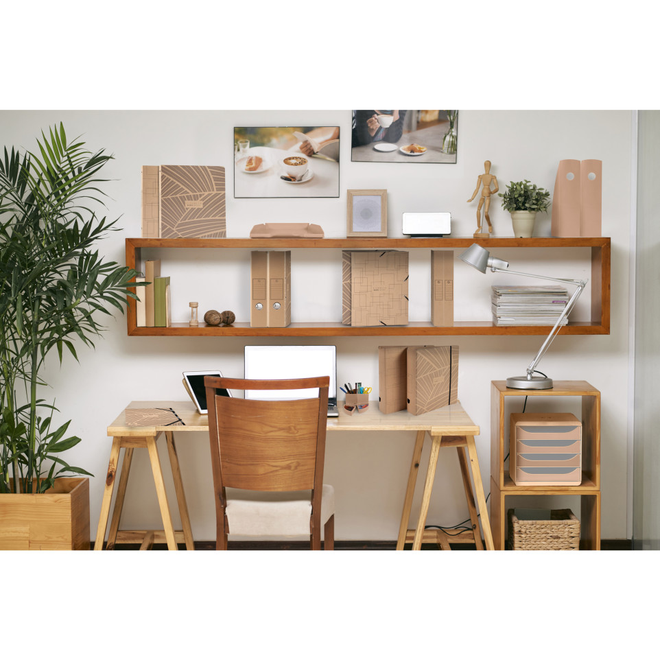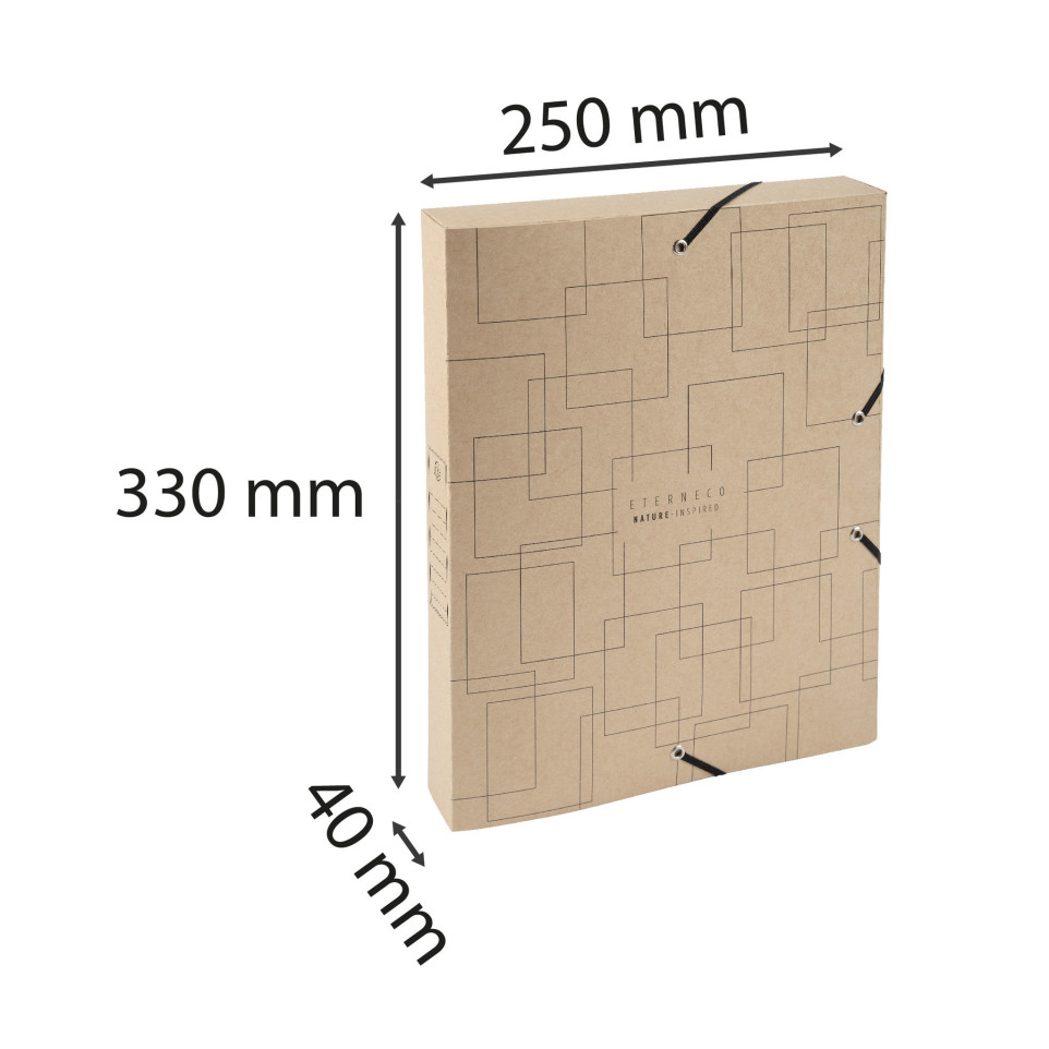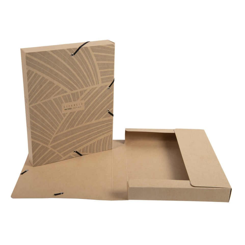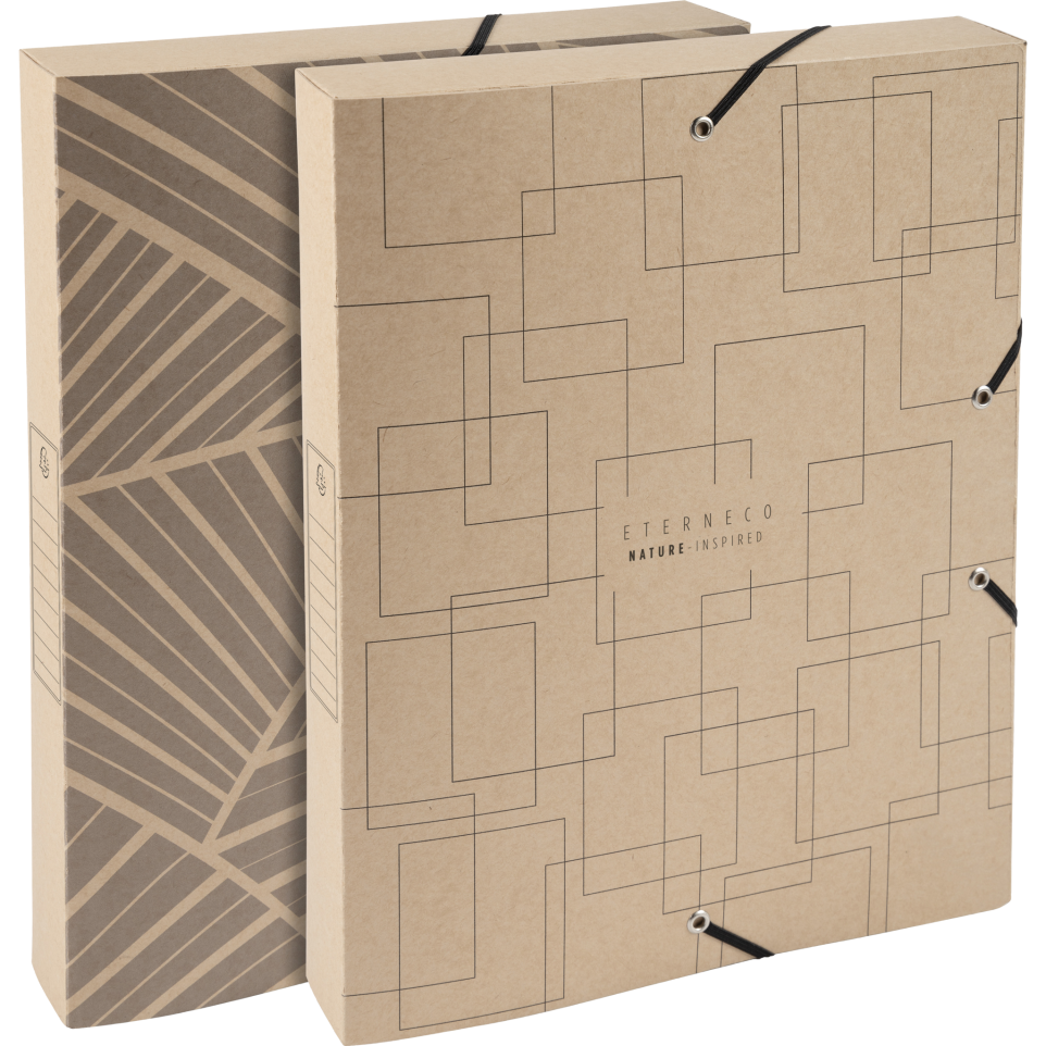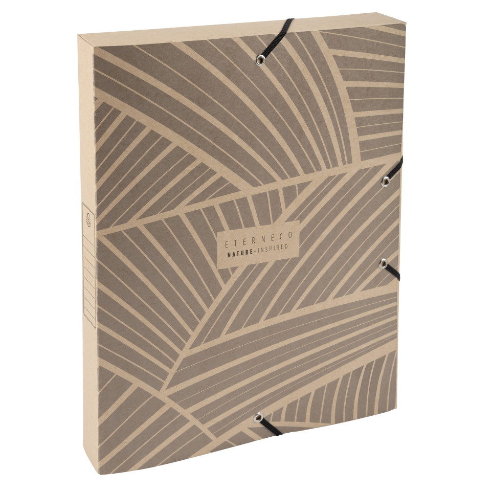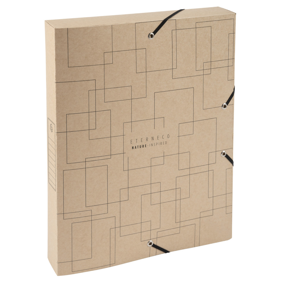 Boite de classement carte enduite Eterneco dos 40mm - A4 Eterneco est une gamme révolutionnaire fabriquée avec une nouvelle carte à l'aspect très naturel et issue de matières végétales : pâte de bois et huile végétale. La couverture de cette boite de classement est conçue dans une carte fabriquée à partir de résidus de bois. La carte est enduite d'huile végétale qui permet une excellente protection à l'eau. La boite est ainsi garantie résistante, durable mais également facile à recycler. Elle remplace aisément les produits en plastique en étant plus écologique. La boite de classement Eterneco est conçue en format 25x33cm pour accueillir des documents A4 mais aussi des chemises à élastiques, dossiers et sous-dossiers. Rivetés, les rabats sont partis intégrantes de la boite pour plus de solidité. Pour conserver un aspect épuré et une fabrication écologique, la boite Eterneco n'a pas d'étiquette collée mais des lignes imprimées pour identifier. Certifiée FSC, entièrement fabriquée en France, Eterneco est assurément la gamme écologique pour des consommateurs citoyens.