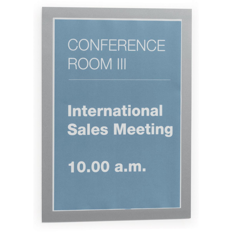 Plaats de Duraframe eenvoudig op een schoon glad oppervlak door de zelfklevende achterzijde. Open vervolgens het magnetische front om documenten snel toe te voegen of te vervangen – perfect zichtbaar vanuit beide richtingen bij montage op glas.