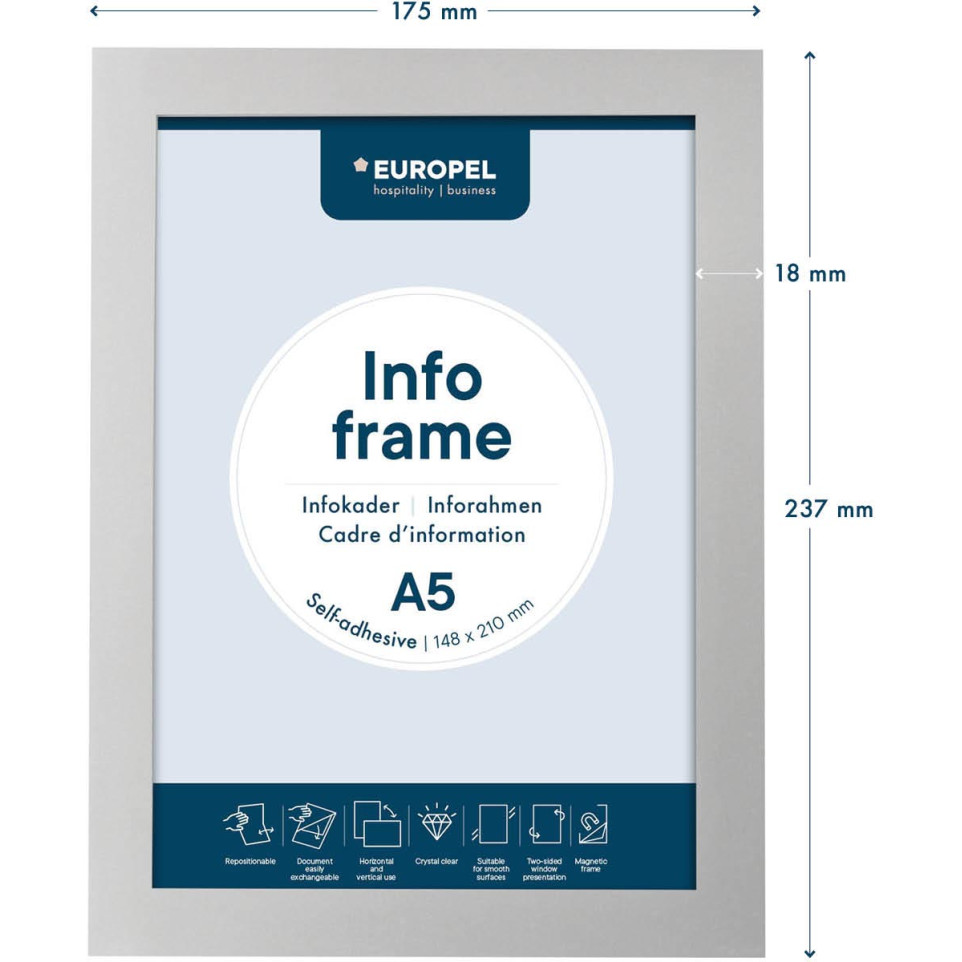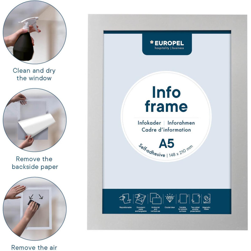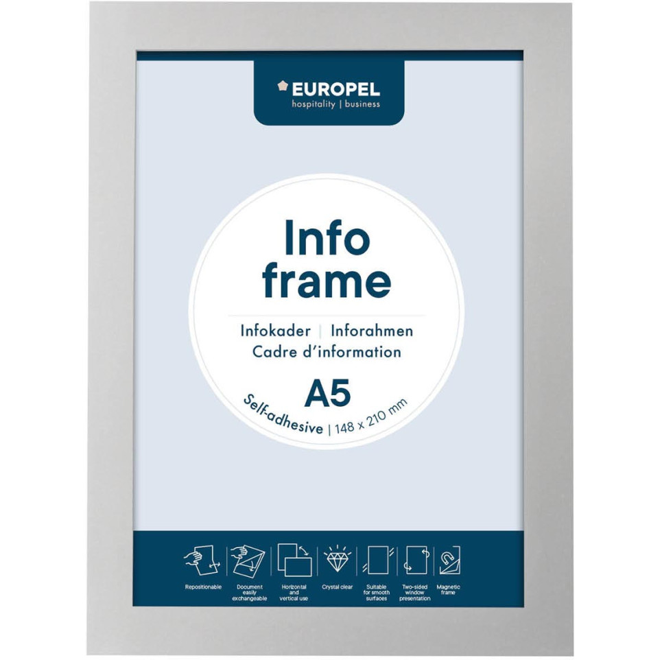 Europel zelfklevend kader A5, zilver, pak van 2 stuks, is geschikt voor het ophangen van A5-formaat papier in kantoorruimtes en thuis.