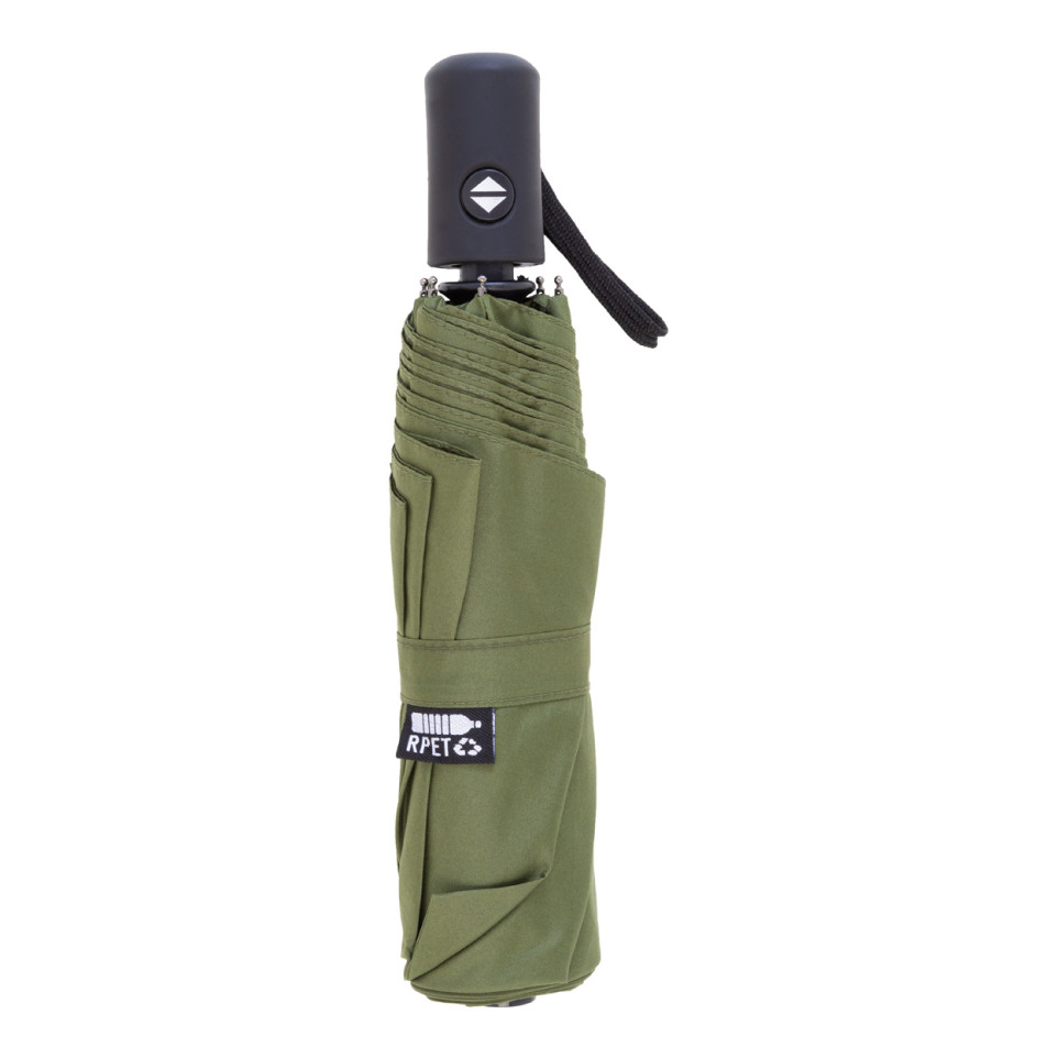 De paraplu is vervaardigd van gerecyclede PET (RPET) pongee en heeft een metalen frame met fiberglas baleinen.