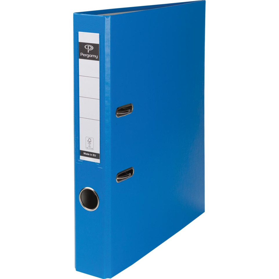 Stevige ordner van Pergamy, geschikt voor A4-documenten. De ordner is ontworpen voor dagelijkse organisatie op school, kantoor of thuis en biedt bescherming en overzicht in een lichtblauwe uitvoering.