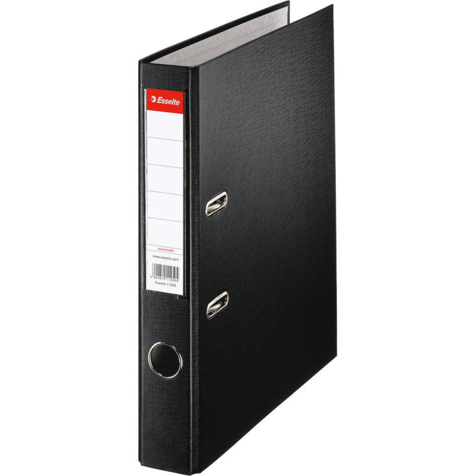 Esselte ordner in zwart, A4-formaat, met 50 mm rug en verstevigd met PP-folie. Ideaal voor het archiveren en organiseren van documenten op kantoor, thuis of op school.