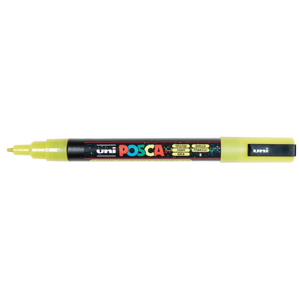 De Uni POSCA paintmarker PC-3ML, met een fijne 1,5 mm punt, biedt glitterende gele accenten op bijna elk oppervlak. Geschikt voor schilderen, tekenen, schrijven en markeren, geeft deze marker heldere, dekkende en levendige kleuren die direct opvallen.