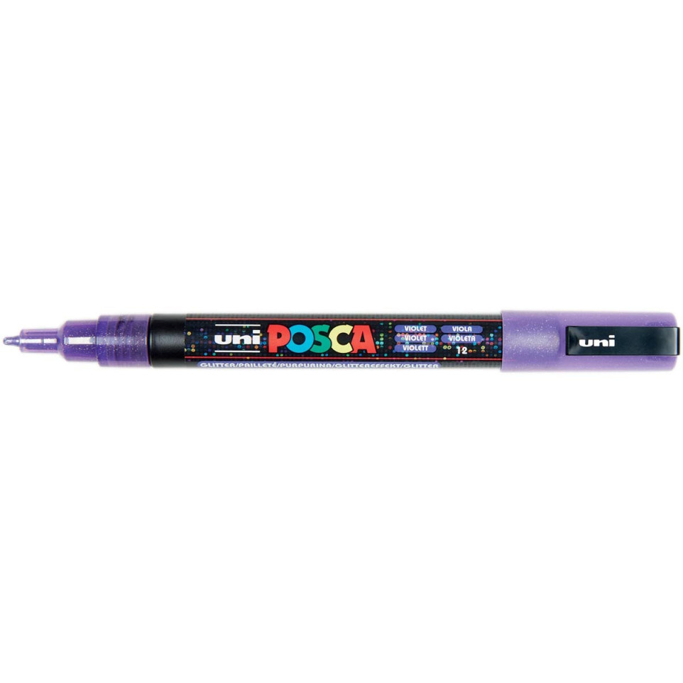 De Uni POSCA paintmarker PC-3ML glitter violet maakt het eenvoudig om te schilderen, tekenen, schrijven en markeren op vrijwel elk oppervlak. Met een schrijfbreedte van 1,5 mm en sprankelende glitters biedt deze marker heldere, ondoorlatende kleuren voor creatief en gedetailleerd werk.