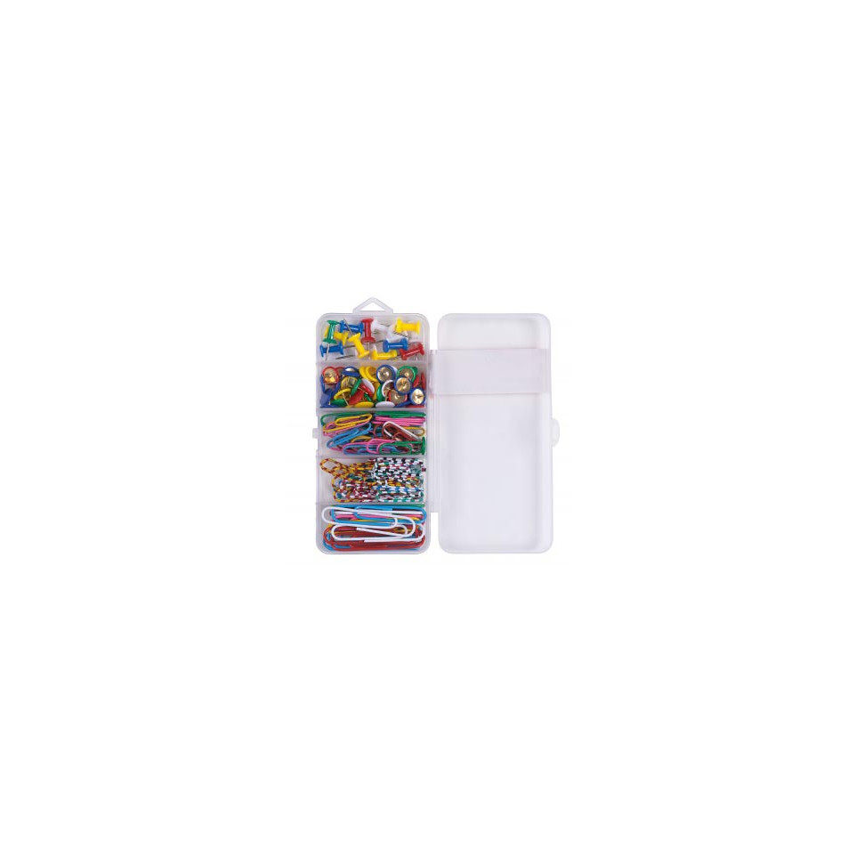 - Inhoud: 15 push pins in geassorteerde kleuren, 50 punaises in geassorteerde kleuren, 30 gekleurde papierklemmen van 26 mm, 20 gestreepte papierklemmen van 28 mm en 20 papierklemmen van 50 mm in geassorteerde kleuren