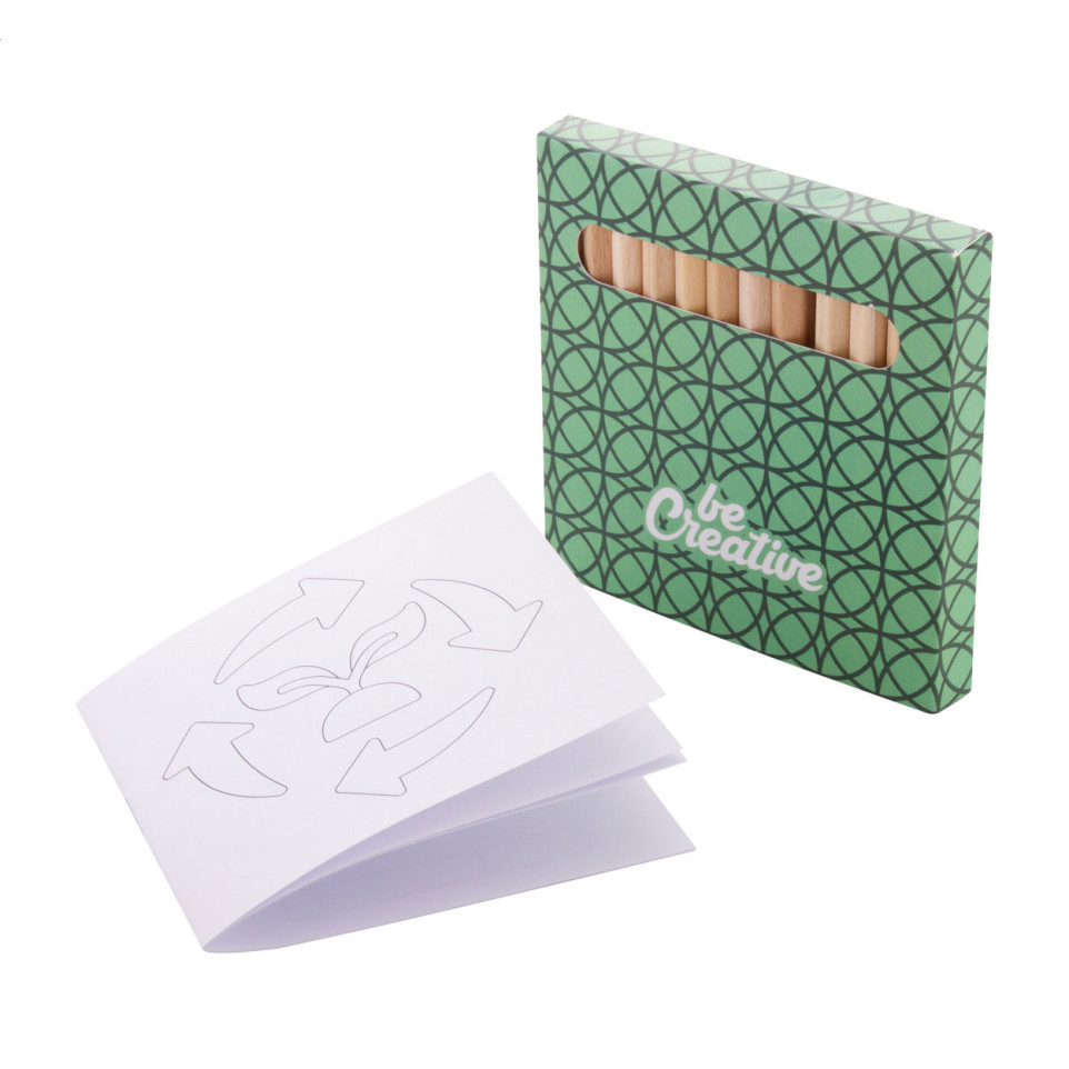 De set bevat twaalf houten kleurpotloden en een thematisch kleurboek in een full-colour bedrukte kartonnen doos.