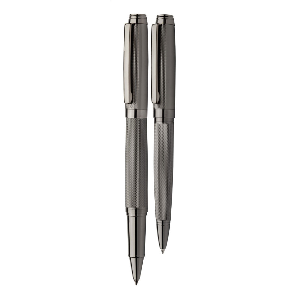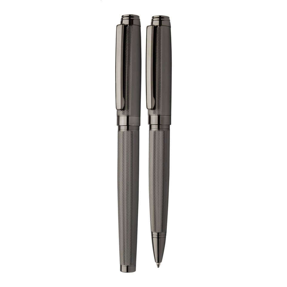 Elegante metalen pennenset bestaande uit een balpen en een rollerpen met een gepatroneerd oppervlak. Geleverd in een stijlvolle zwarte geschenkdoos met blauwe vulling. Een exclusief André Philippe merkproduct.