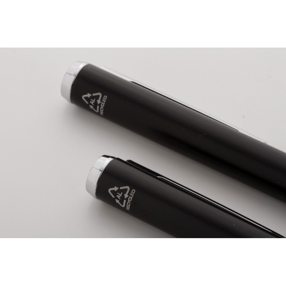 De Ralum pen set bestaat uit een hoogwaardige rollerpen en balpen van gerecycled aluminium, verpakt in een elegante zwarte papieren geschenkdoos. Beide pennen worden geleverd met blauwe inkt, perfect voor dagelijks professioneel gebruik.