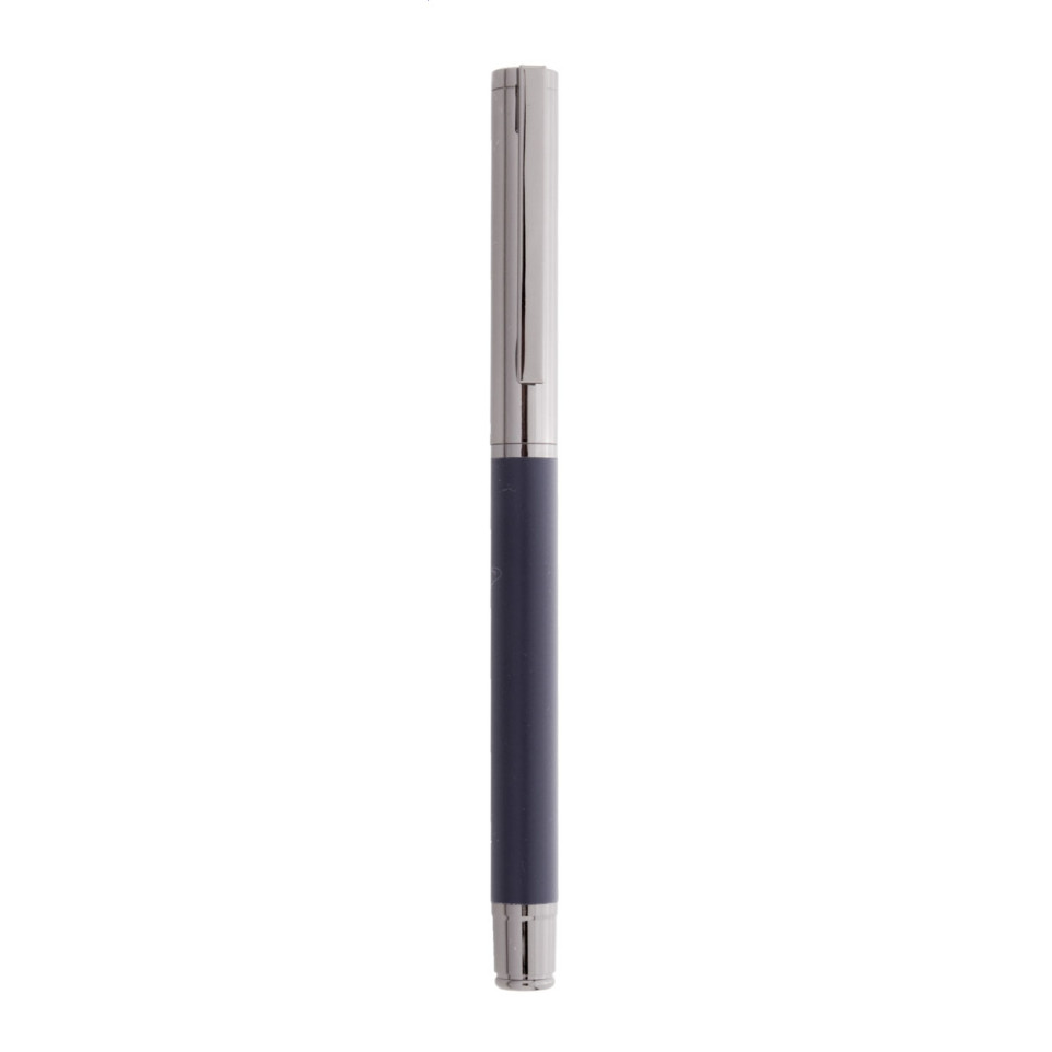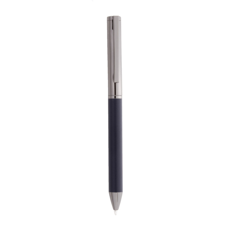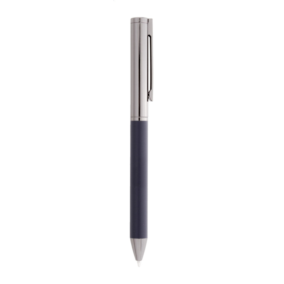 Elegante metalen pennenset bestaande uit een balpen en rollerpen, gepresenteerd in een stijlvolle zwarte papieren geschenkdoos. Voorzien van blauwe inkt voor vloeiend schrijfcomfort in professionele omgevingen.