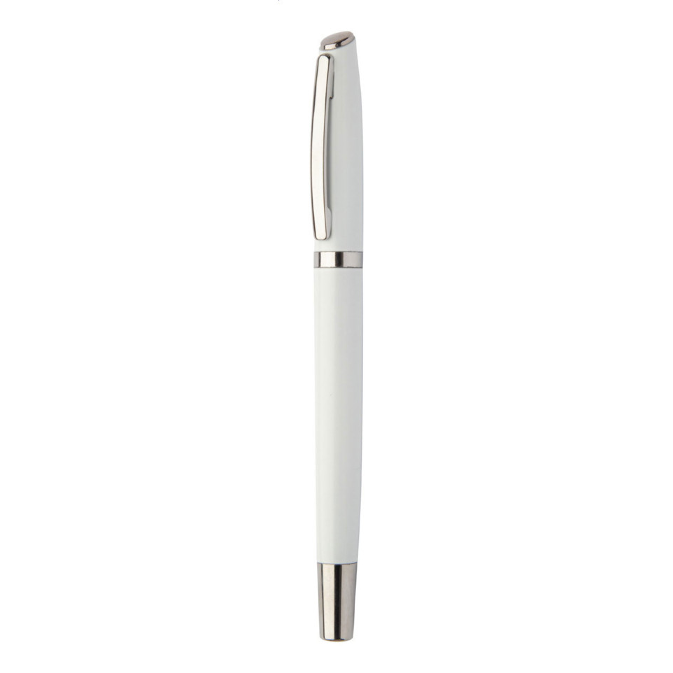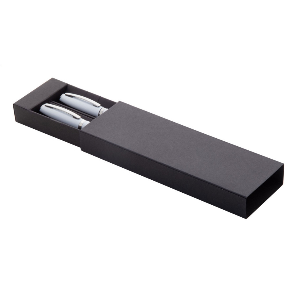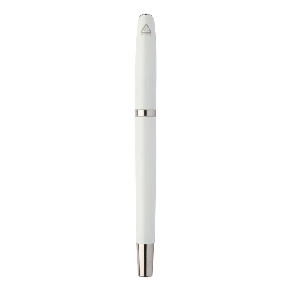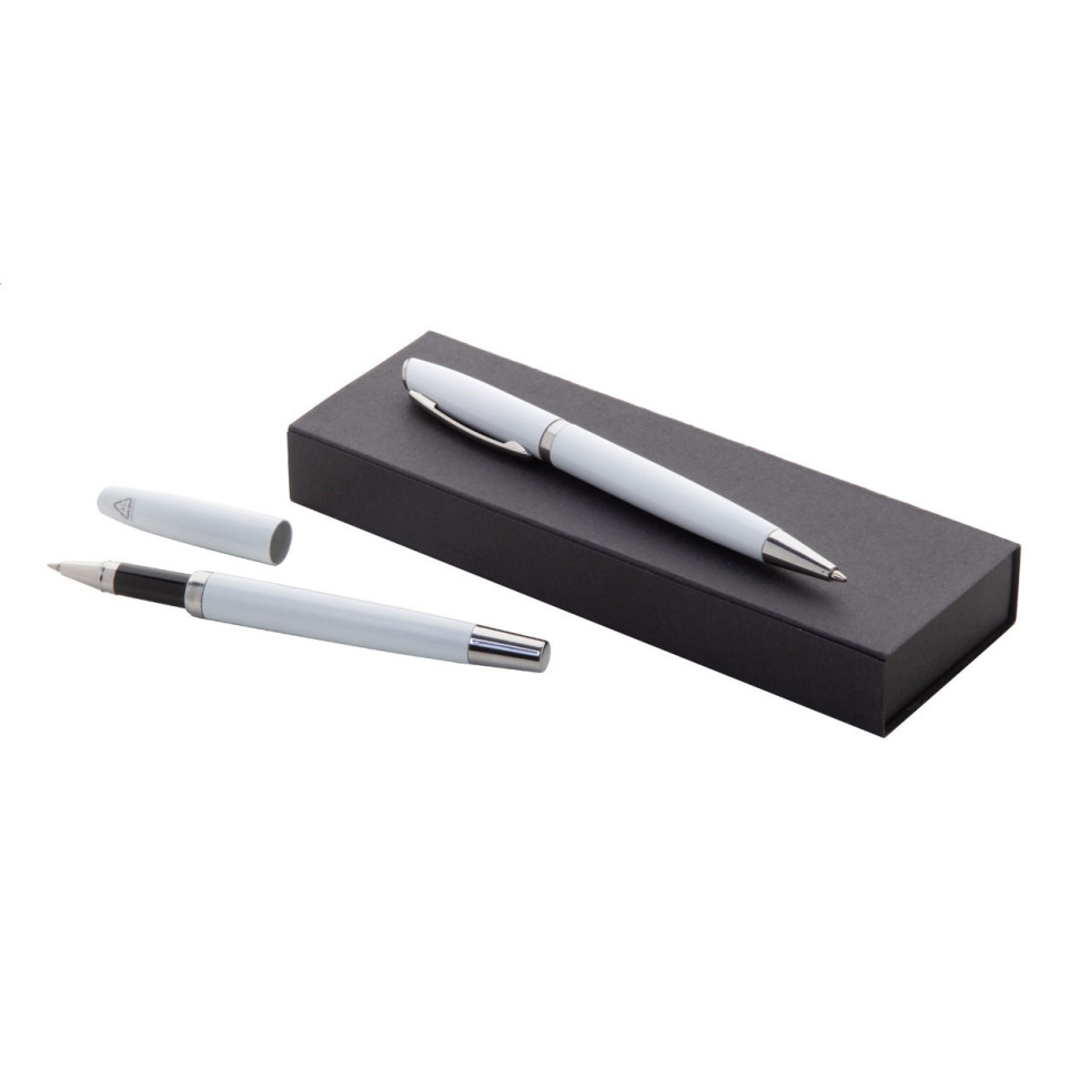 De Redivi white pen set bestaat uit een roller- en balpen met blauwe vulling, beide vervaardigd uit gerecycled aluminium en stijlvol verpakt in een zwart papieren geschenkdoosje. Ideaal als geschenk of voor dagelijks professioneel gebruik.