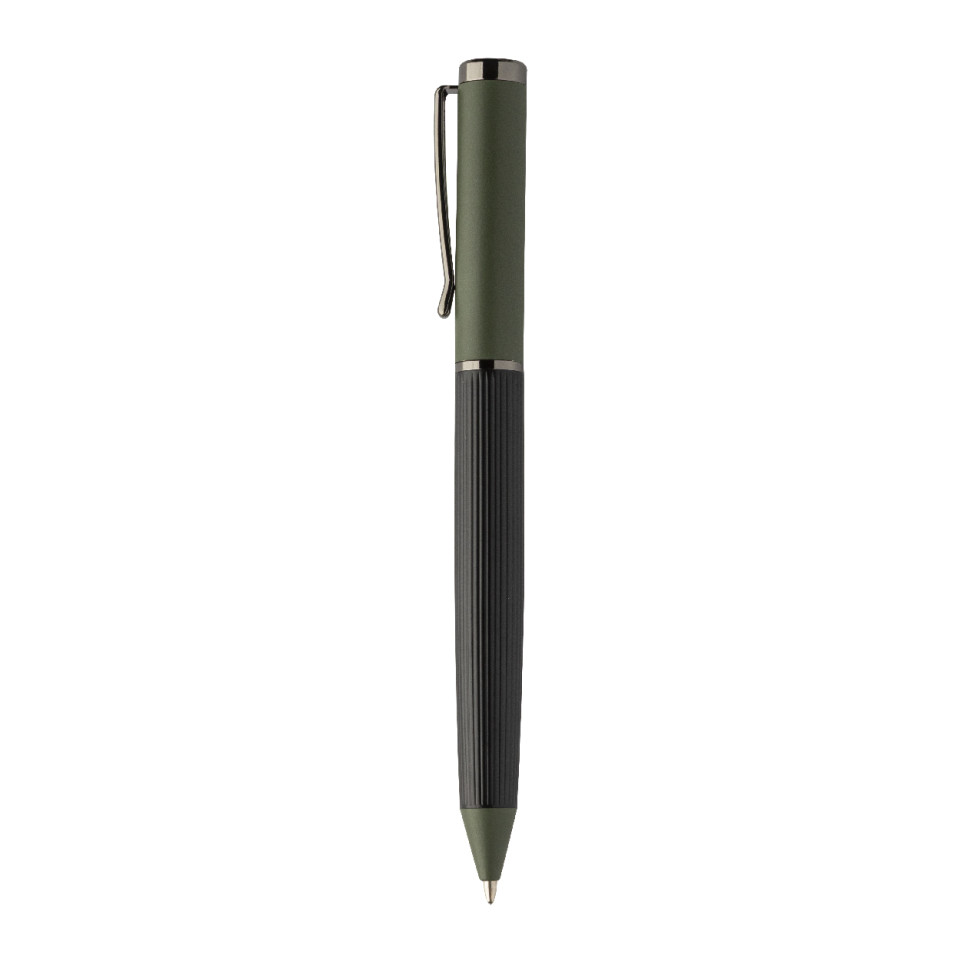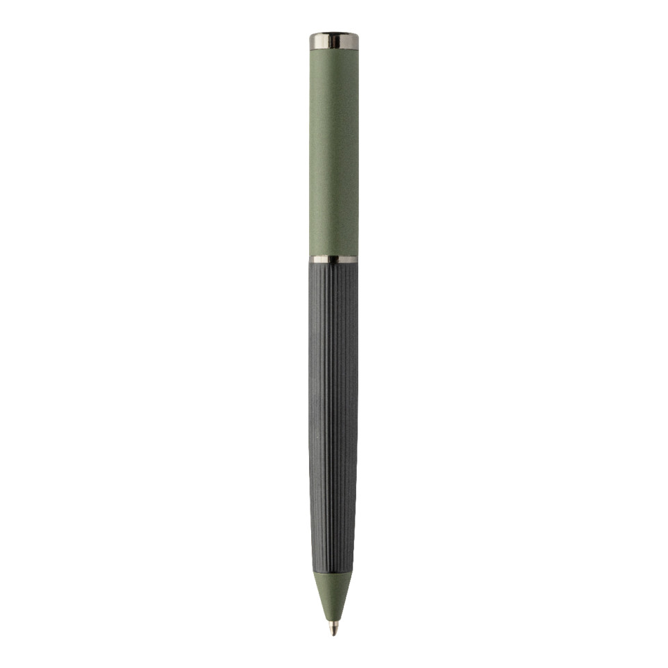 Elegante pennenset bestaande uit een metalen balpen en rollerbalpen, uitgevoerd met gestreepte lopen, gekleurde accenten en glanzende gunmetal details. Geleverd in een bijpassende geschenkdoos, ideaal voor professioneel gebruik of als relatiegeschenk.