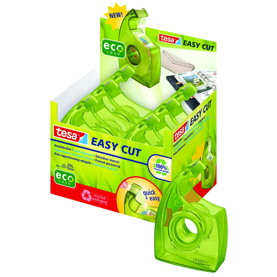 De tesa Easy Cut handdispenser ecoLogo is een ergonomisch gevormde, milieuvriendelijke houder voor tesafilm. Ideaal voor kantoor of thuis; geschikt voor repareren van papier, sluiten van enveloppen en samenvoegen van documenten.