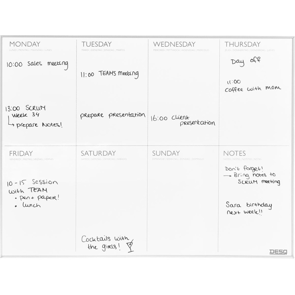 Bruikbaarheid De Desq magnetische weekplanner is ideaal voor kantoorruimtes en thuis, waar je een overzichtelijke en praktische manier nodig hebt om je agenda te beheren. Het magnetische oppervlak maakt het mogelijk om notities en aantekeningen op te hangen, waardoor je altijd snel toegang hebt tot belangrijke informatie.