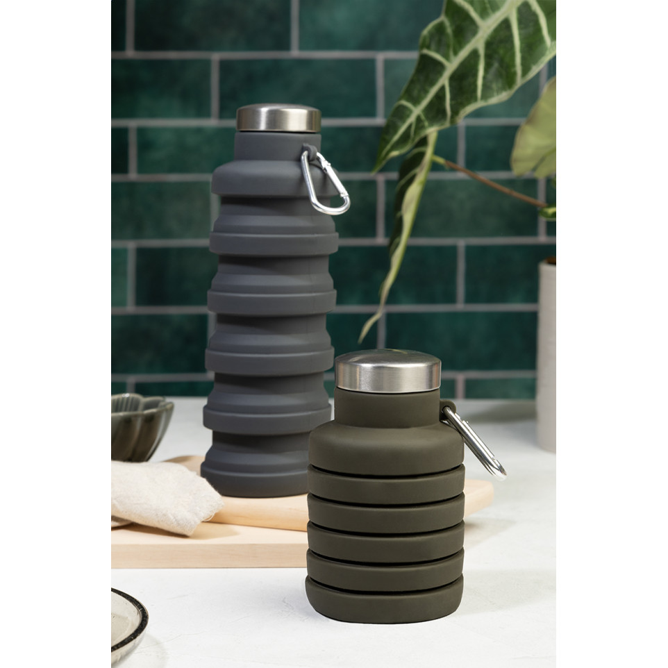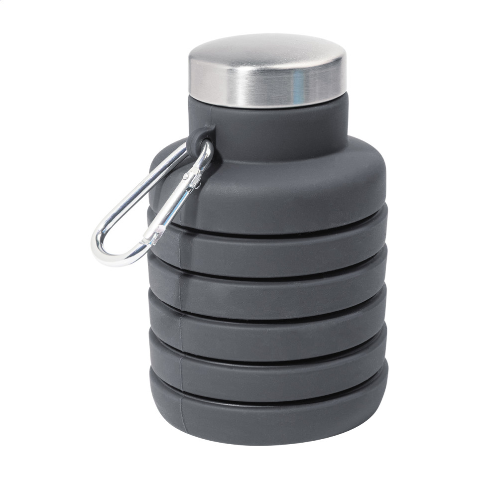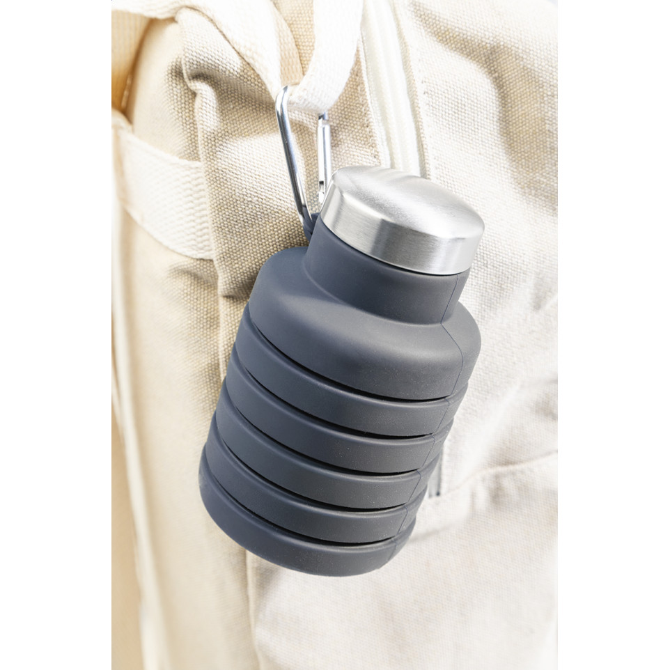De Colsip donker grijs opvouwbare fles is een inklapbare siliconenfles van 500 ml met roestvrijstalen deksel en aluminium karabijnhaak. Ideaal voor onderweg, outdooractiviteiten of dagelijks gebruik waar compactheid telt.