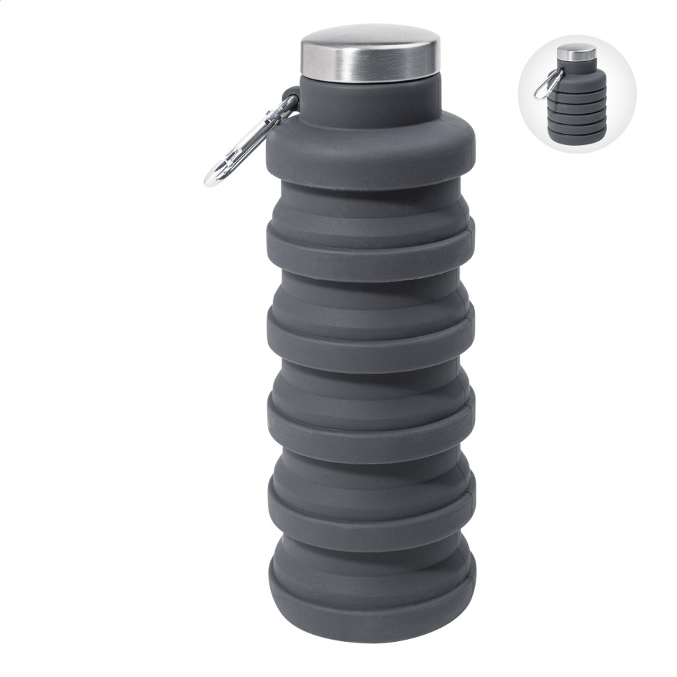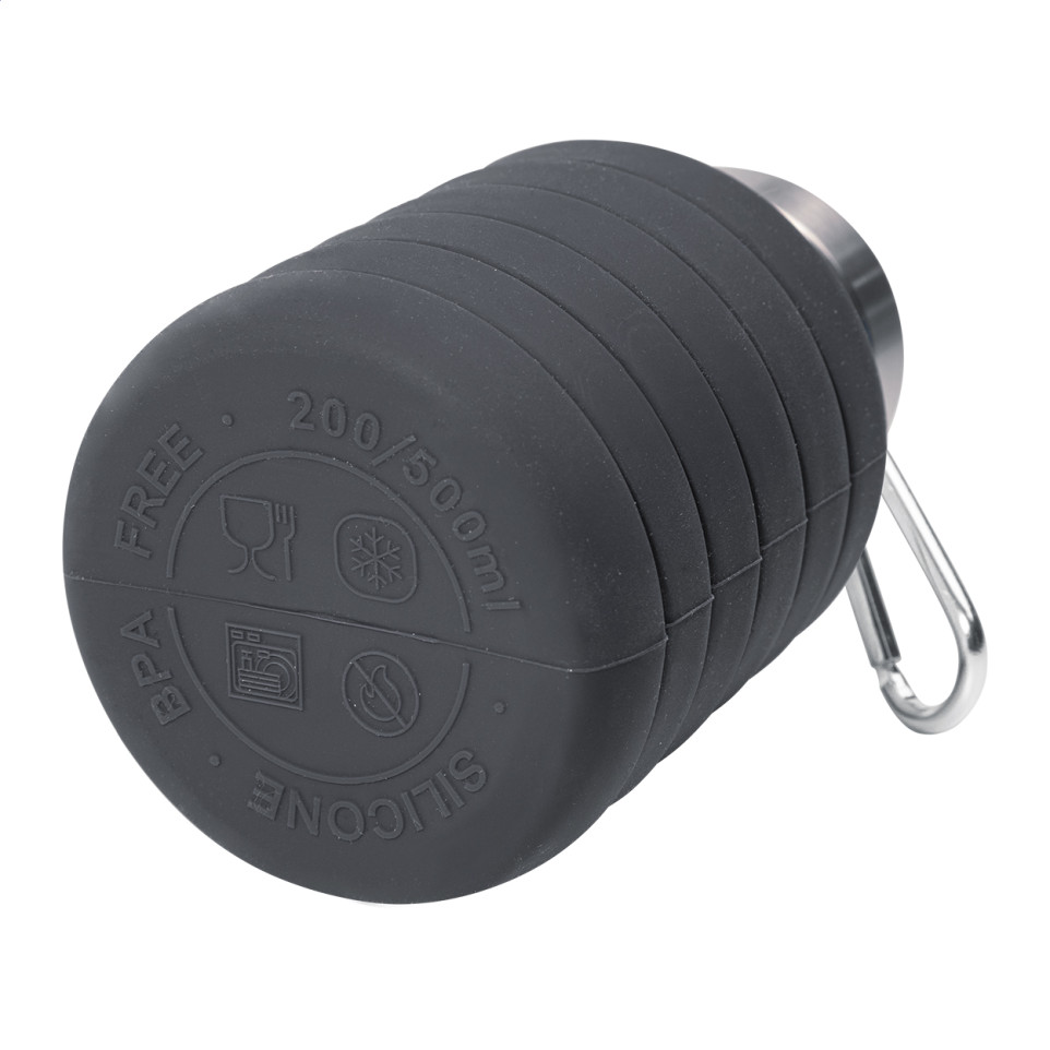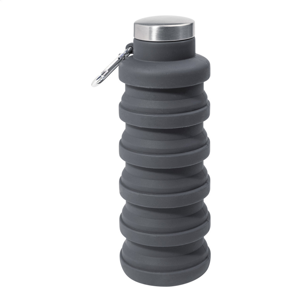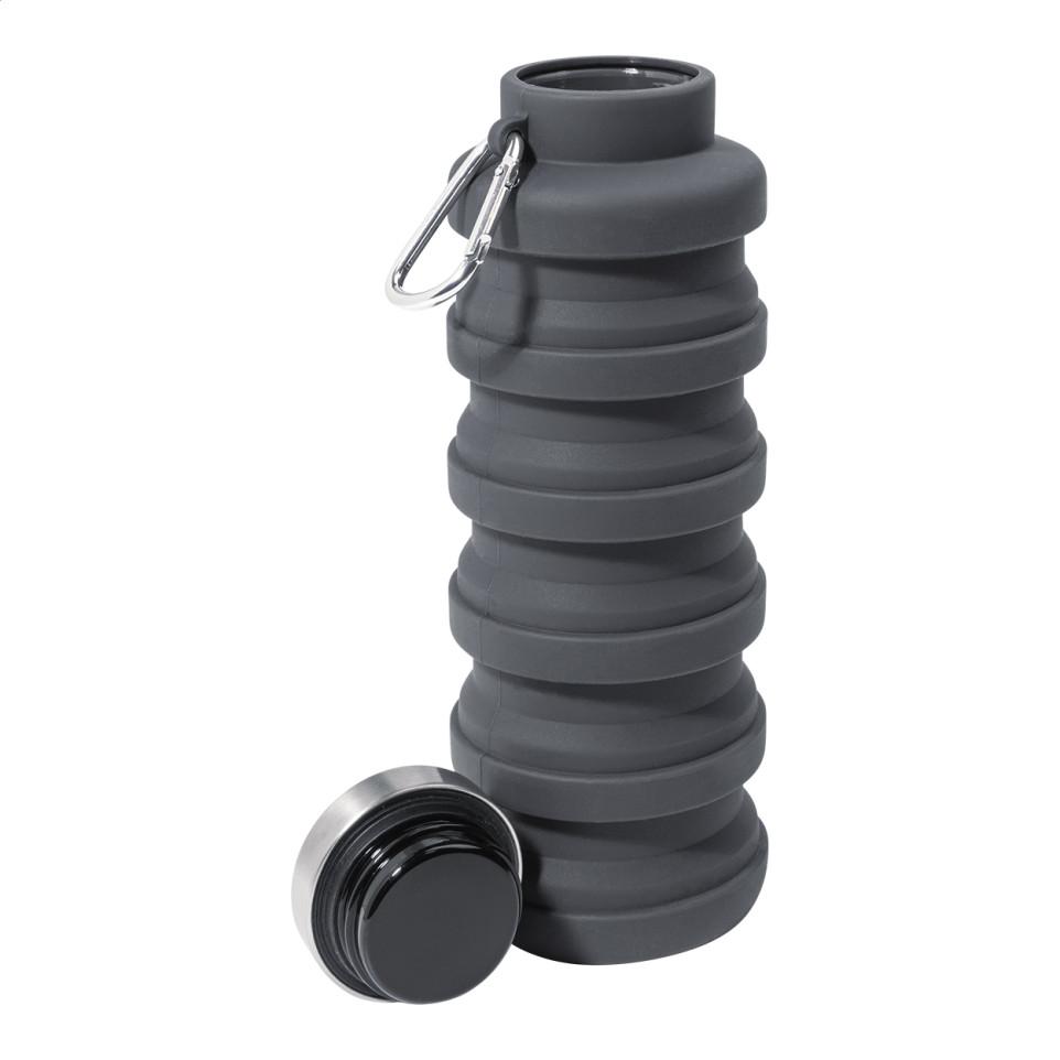 De Colsip donker grijs opvouwbare fles is een inklapbare siliconenfles van 500 ml met roestvrijstalen deksel en aluminium karabijnhaak. Ideaal voor onderweg, outdooractiviteiten of dagelijks gebruik waar compactheid telt.