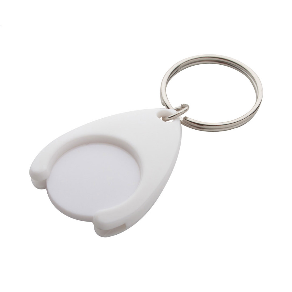 Plastic winkelwagenmuntenhouder in wit met metalen sleutelhanger. Geschikt voor winkelwagenmunten met een diameter van 24 mm en een dikte van 2 mm. Compact formaat voor dagelijks gebruik aan de sleutelbos.