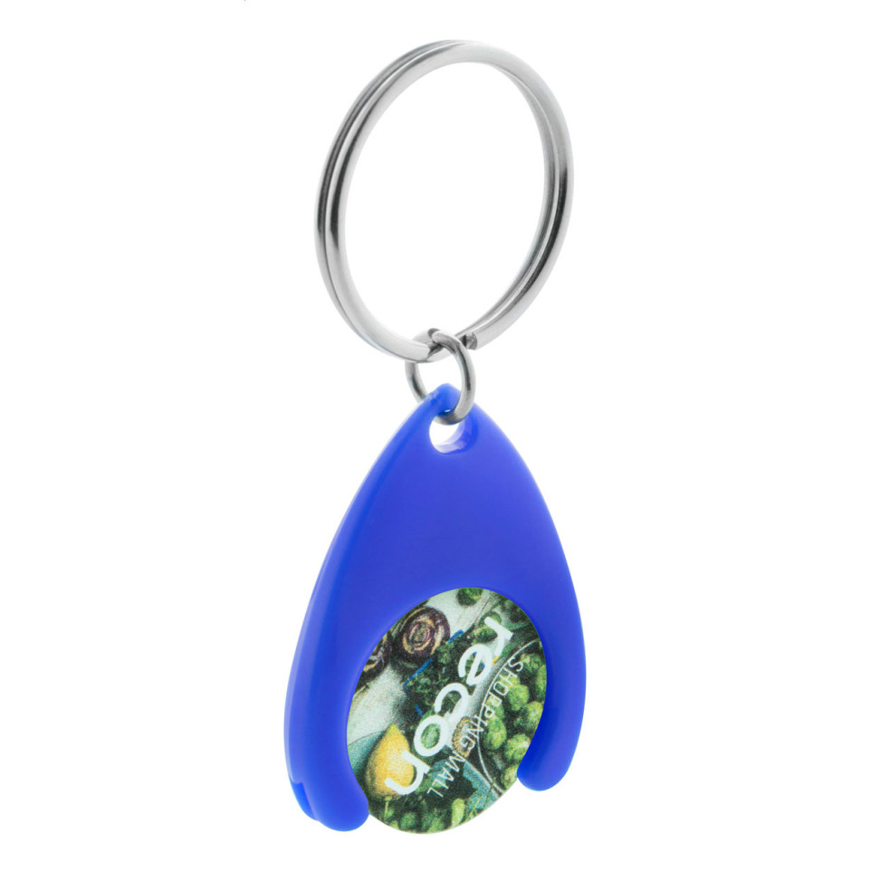 Compacte plastic winkelwagenmuntenhouder in de kleur blauw, voorzien van een metalen sleutelhanger. De houder bevat een makkelijk uitneembare munt met een diameter van 24 mm en een dikte van 2 mm, ideaal voor gebruik bij winkelwagens.