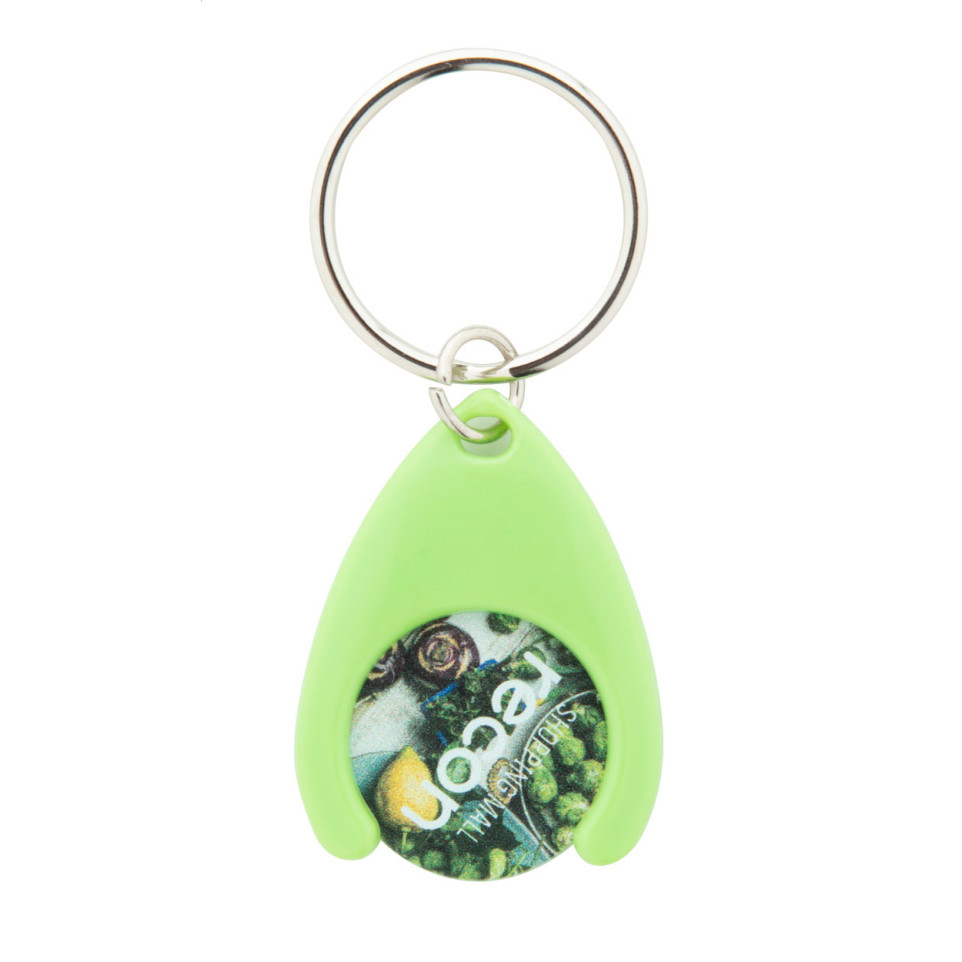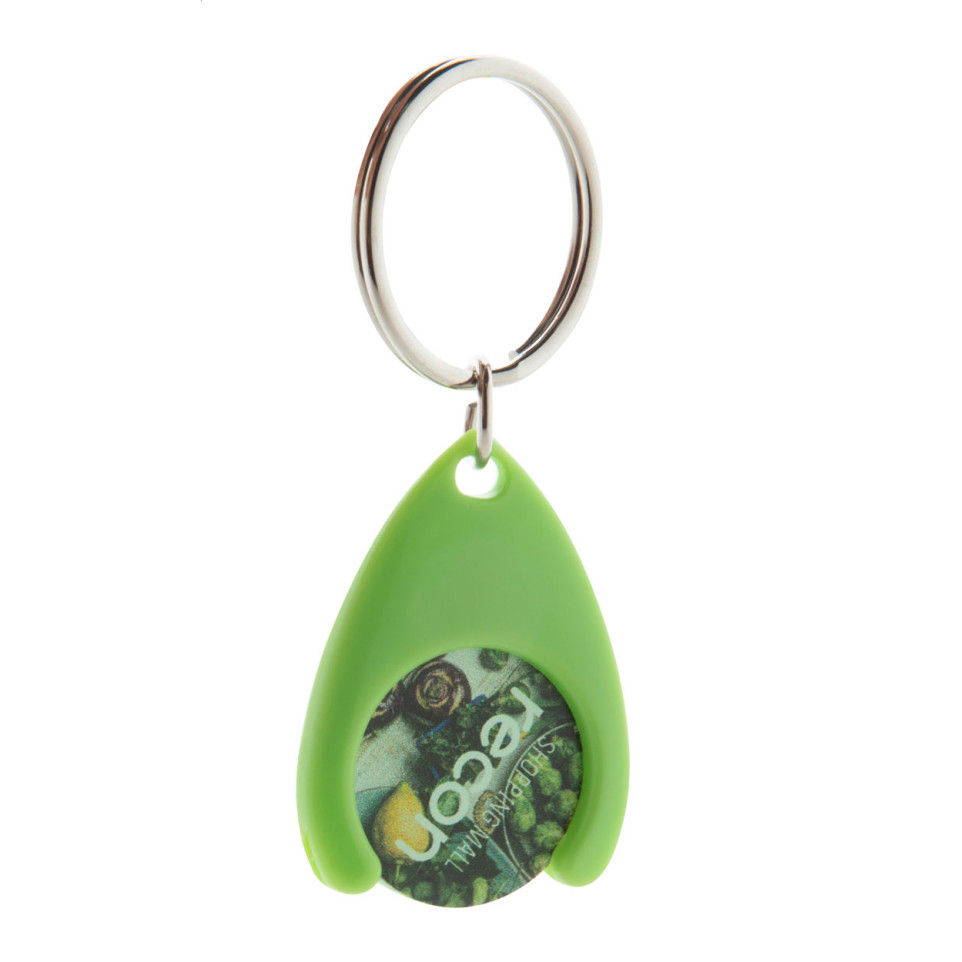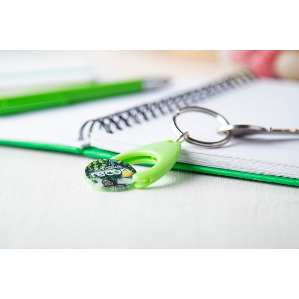 Handige plastic winkelwagenmuntenhouder in het groen, voorzien van metalen sleutelhanger. Ideaal om altijd een winkelwagenmunt bij de hand te hebben, met een munt van 24×2 mm diameter.