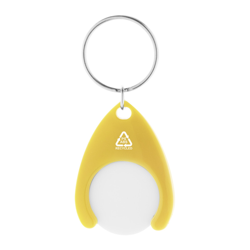 Deze sleutelhanger is vervaardigd uit gerecyclede ABS- en PS-kunststof en heeft een metalen ring.